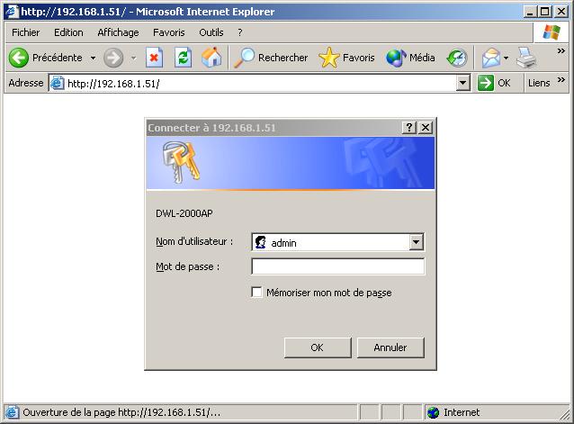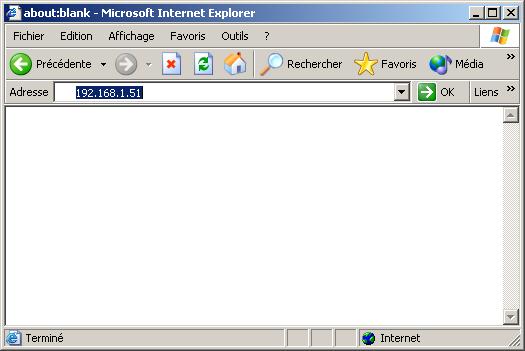 Une fois l’ordinateur connecté au point d’accès et son adresse IP configurée correctement, il suffit d’entrer l’adresse de la borne (192.168.0.50) dans le navigateur Internet Explorer.