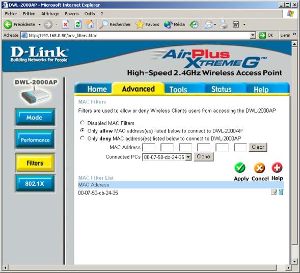 Pour simplifier la vie de l’administrateur, le constructeur a prévu une fonction "Clone" très pratique : il suffit de configurer les ordinateurs pour qu’ils se connectent à la borne (cf. l’article Configurer XP pour un réseau WiFi), ainsi la borne les détecte et affiche leur adresse MAC dans la petite fenêtre déroulante. Il ne reste plus qu’à sélectionner les adresses l’une après l’autre et cliquer sur "Clone" puis sur "Apply" à chaque fois : les adresses sont ajoutées dans la liste et on n’a pas besoin de les entrer toutes à la main !