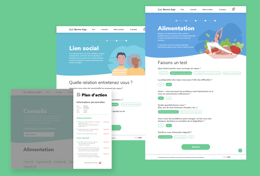 Grâce à un questionnaire de repérage, {La} Bonne App’ proposera des conseils personnalisés ainsi que des actions, en lien avec les conseils donnés. Le professionnel, en accord avec la personne accompagnée pourra générer un plan d’action en rapport avec les éléments identifiés.