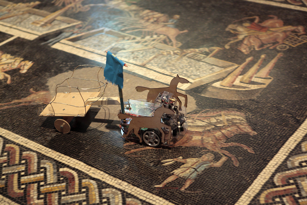 Vivre une course de quadriges par l’entremise d’un jeu d’arcade robotisé se déroulant sur la « mosaïque des jeux du cirque » : mosaïque au sol représente un cirque qui devait se trouver à Lyon avec le détail d’une course de char.