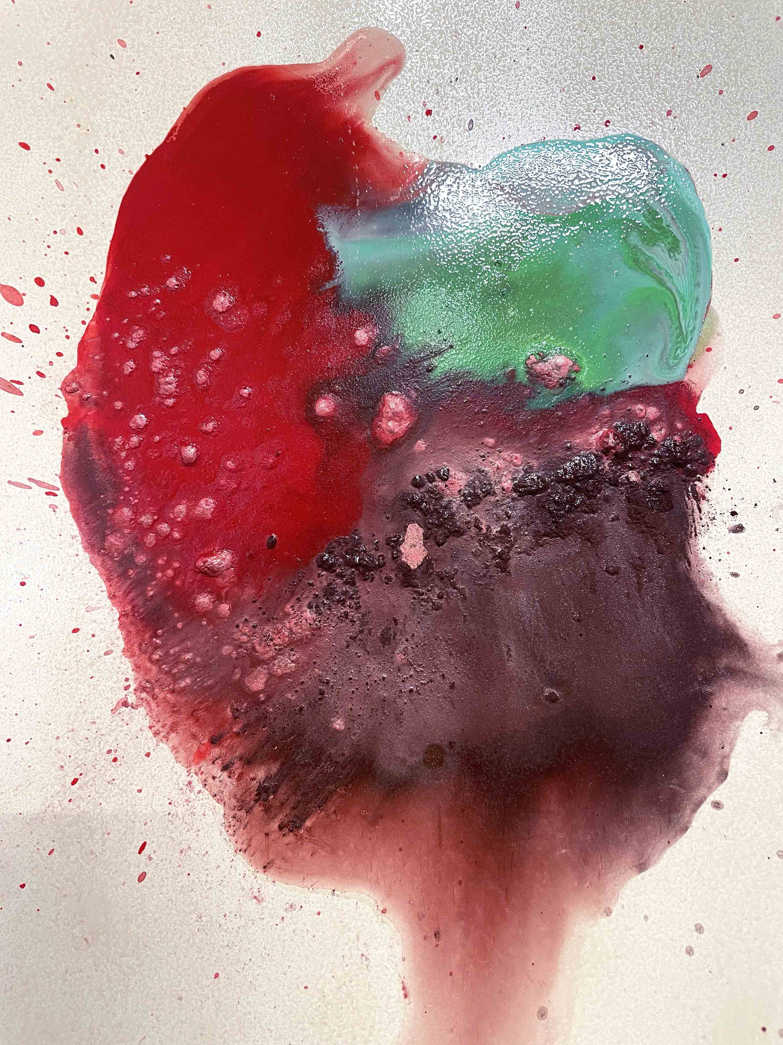 Dans l’optique de s’inscrire dans l’hors norme et la déviance, nous avons aussi choisi de concevoir une identité qui va dans ce sens. Une des volontés de Komplex était aussi de liée digital et réel notamment par l’utilisation de matière et textures spécifiques. Alors, nous avons pris en photo des peintures de Pierre (qui est aussi plasticien), afin de jouer avec leur couleur, saturation, contraste pour obtenir une trame. Ainsi, nous avons pu définir nos choix colorimétriques et nous servir de cette trame comme un fond, un des éléments forts de notre identité.