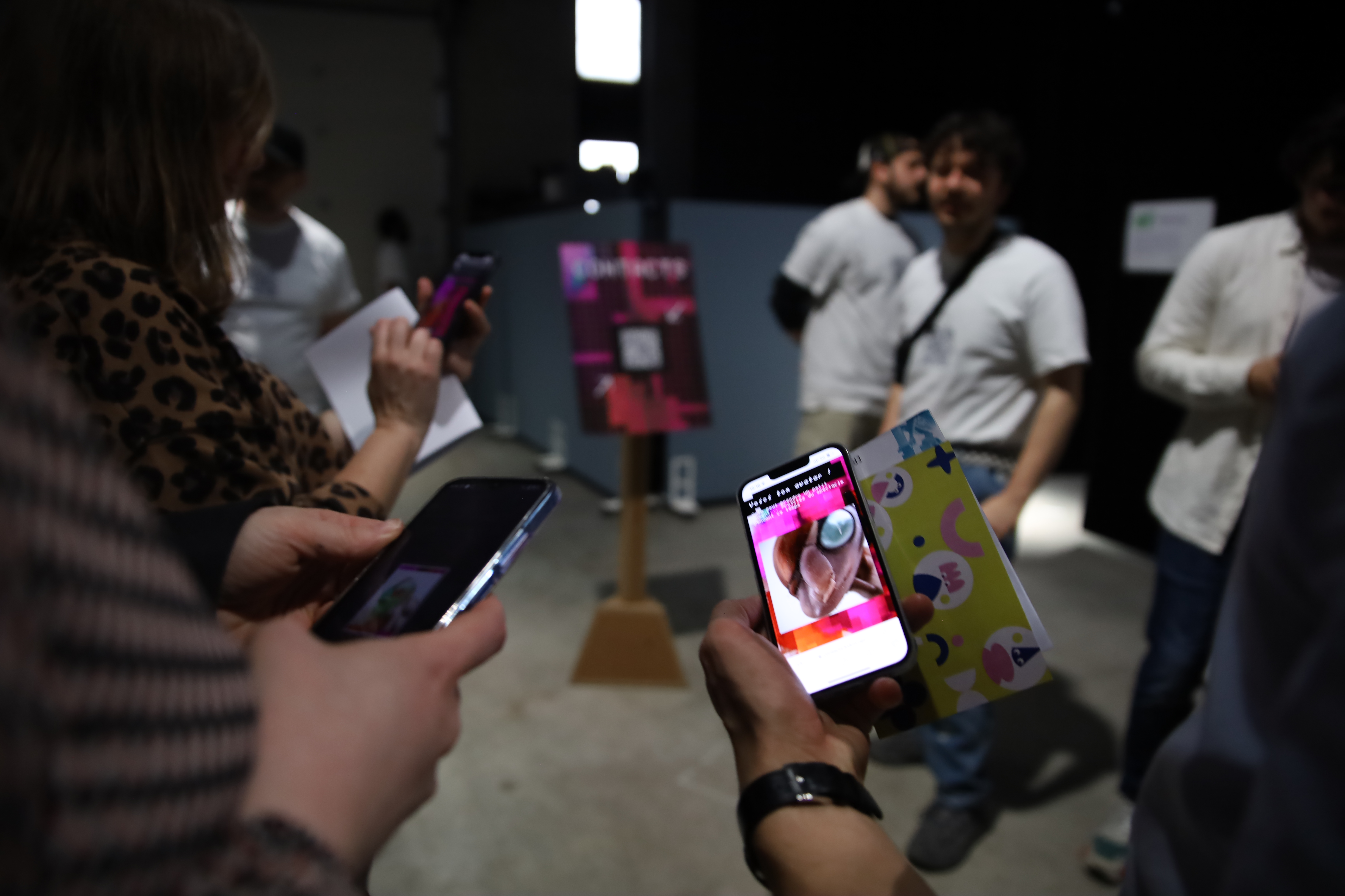 Des QR Codes étaient présents sur des t-shirts de l’équipe pour accéder à l’application “Contacts”, permettant de générer son Avatar, qui serait projeter sur la partie vidéoprojection.