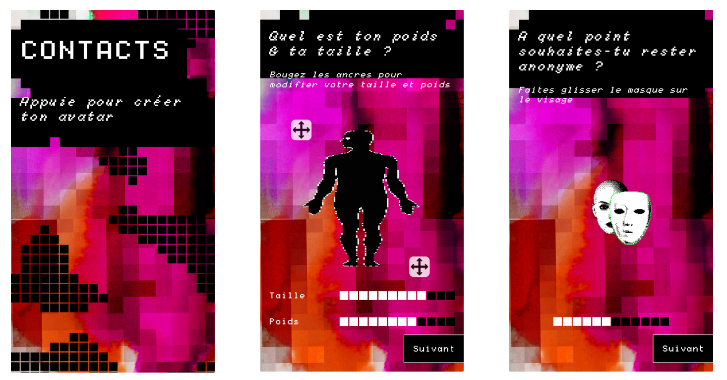 [Contacts] est un carnaval digital pirate qui souhaite, via son application, s’attribuer une réappropriation digitale et activiste de la figure historique du carnaval en créant une expérience immersive et participative qui explore l’hybridation entre le réel et le virtuel. Il invite à repenser le rapport au réel et aux normes de l’identité.
