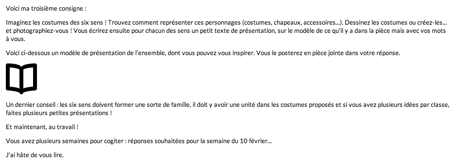 Après avoir lu la scène 1, ré-écrit et joué la scène 2, les élèves imaginent à présent les costumes des personnages de la scène 3 qui ne sont autres que les 5 sens.