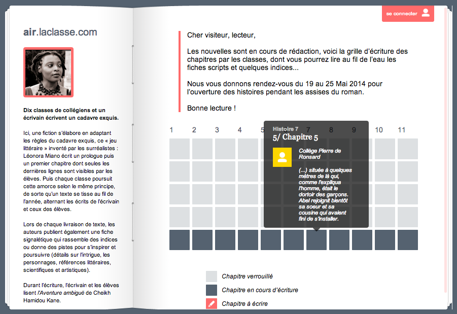 L’écrivain Léonora Miano, prix Femina 2014 pour son livre "La saison de l’ombre", est actuellement en résidence sur laclasse.com où elle écrit en ligne avec dix classes sous la forme d’un cadavre exquis.