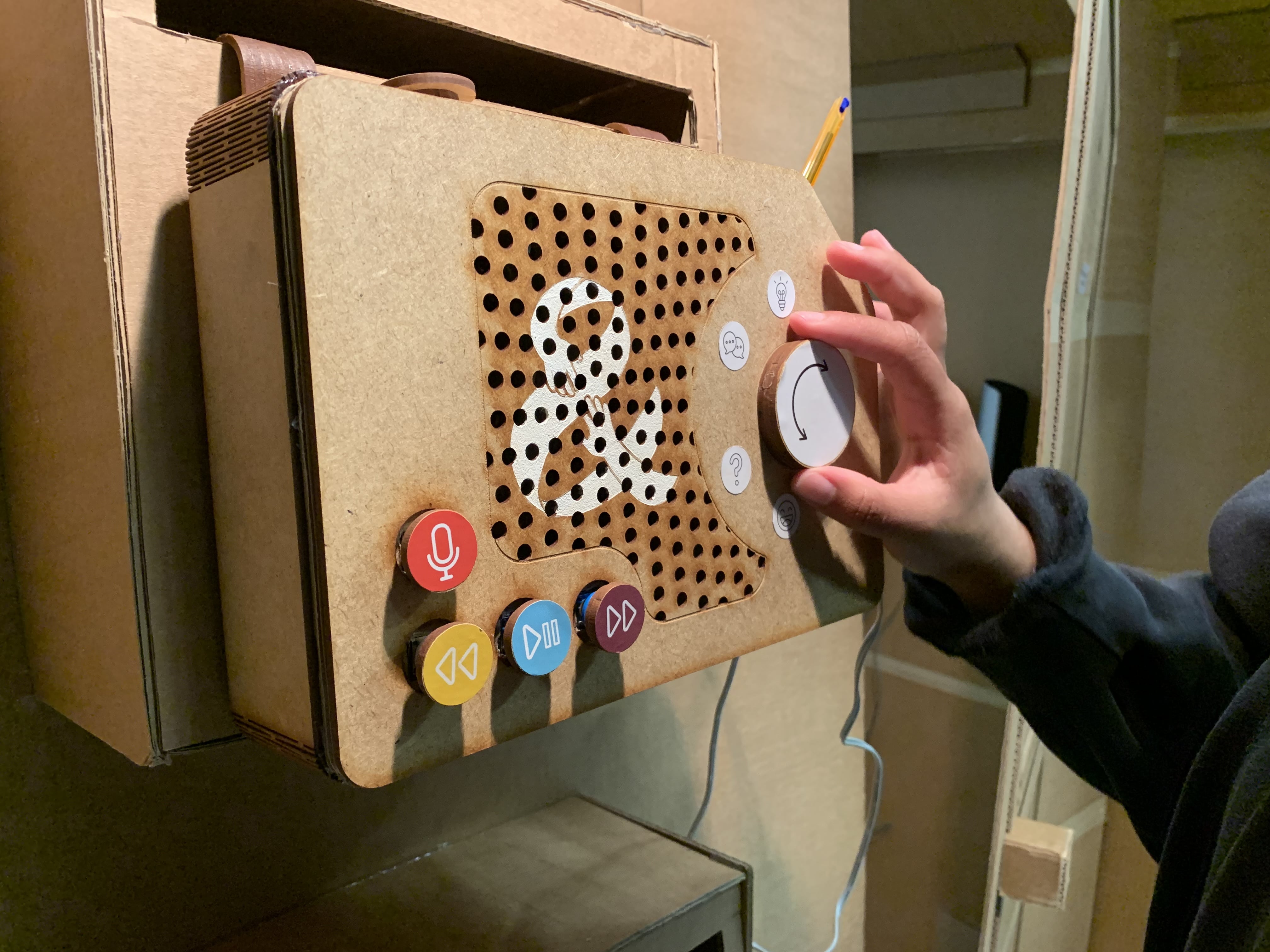Il tourne alors le bouton blanc pour sélectionner la catégorie “proposition de services”. ça tombe bien, quelqu’un a déjà laissé un message et propose de réaliser des travaux de bricolages sur son temps libre ! M.Béjart en profite donc pour noter le nom de ce voisin ainsi que l’étage où il réside sur une des pages du bloc-notes inclus avec Contact & Nous. Ceci fait, il prend le temps d’écouter les enregistrements de la catégorie “anecdotes”, une option qui le divertit énormément. A la fin de son utilisation, il en profite lui aussi pour tester la fonction enregistrement dans cette même catégorie. Il descend ensuite raccrocher Contact & Nous sur l’une des boîtes aux lettres du hall.