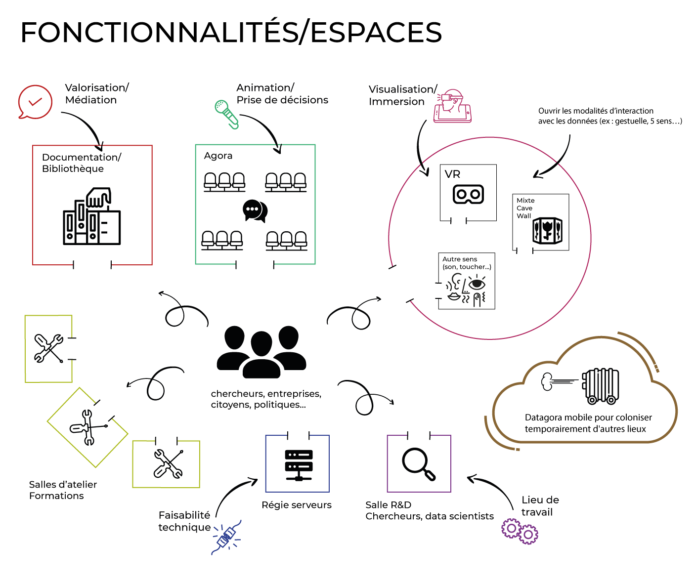 Les ressources présentes dans cet espace sont humaines (compétences d'analyses pluridisciplinaires, d'ingénierie de données, de médiation) et techniques (équipements informatiques adaptés, jeux de données à disposition).