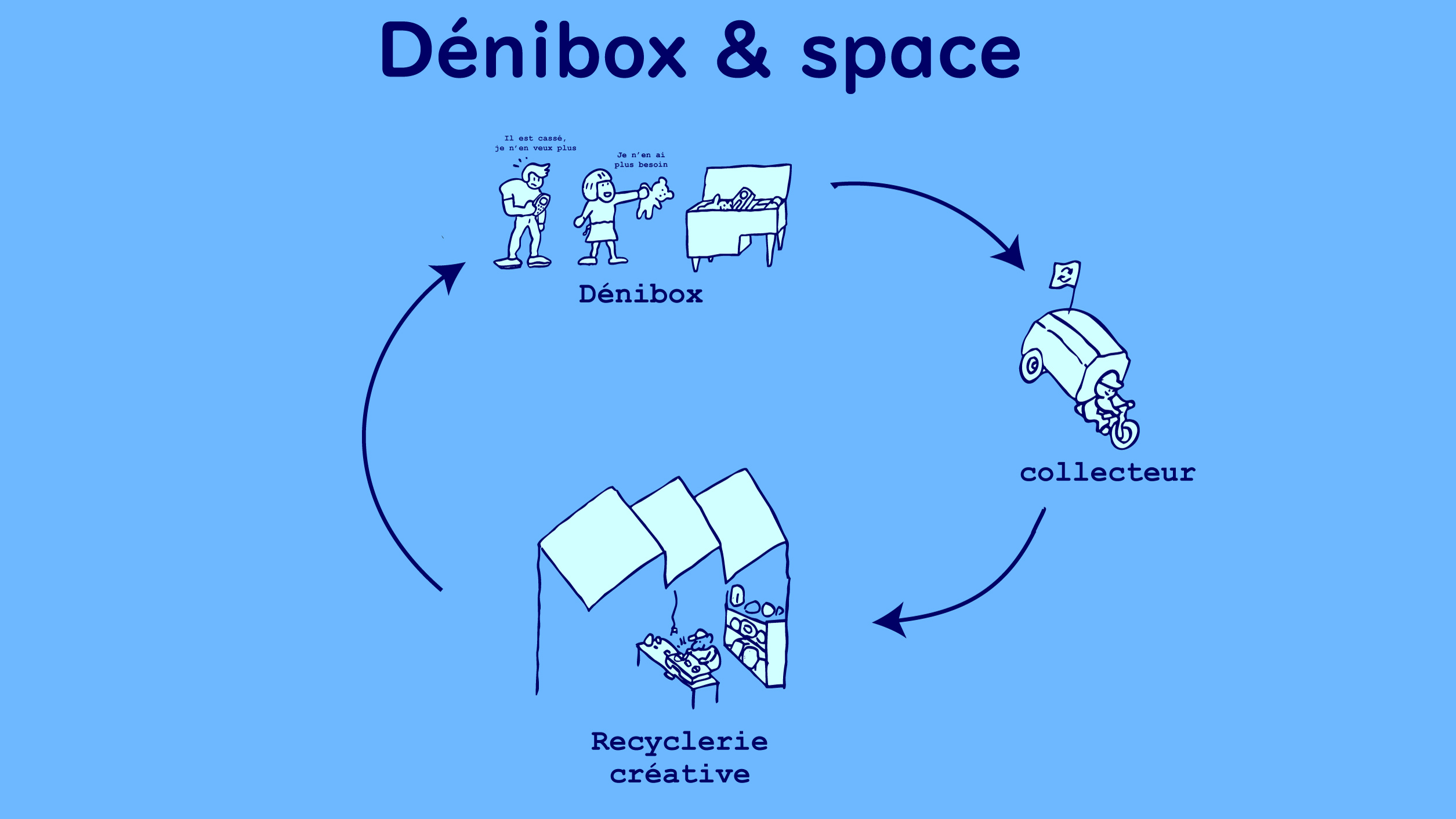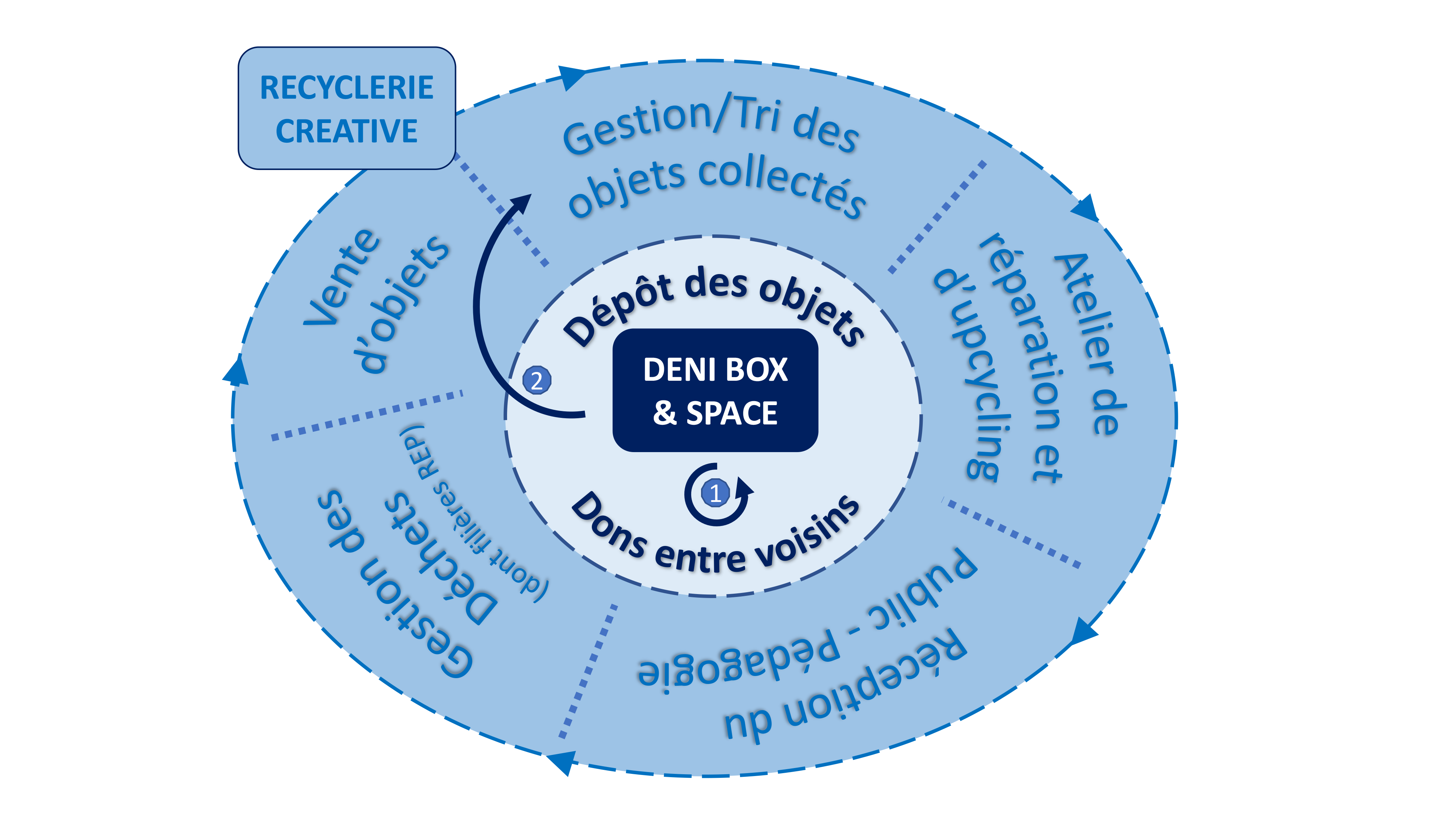 Jacques, employé de l’entreprise TRIOLIDAIRE (structure de l’économie Sociale et Solidaire située à quelques minutes de l’immeuble), vient collecter tous les 15 jours la “DENI BOX & SPACE”. Les objets ainsi récupérés sont acheminés vers le local de la structure, une recyclerie créative. Au sein de cet espace offrant une nouvelle vie aux objets, ces derniers sont réceptionnés, triés, réparés, remis en état grâce aux employés en insertion. Un espace de revente est aussi présent dans la recyclerie permettant d’offrir aux habitants du territoire de nouveaux produits.