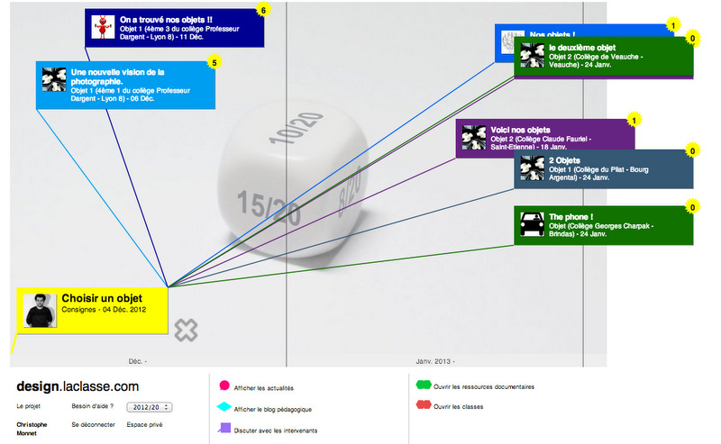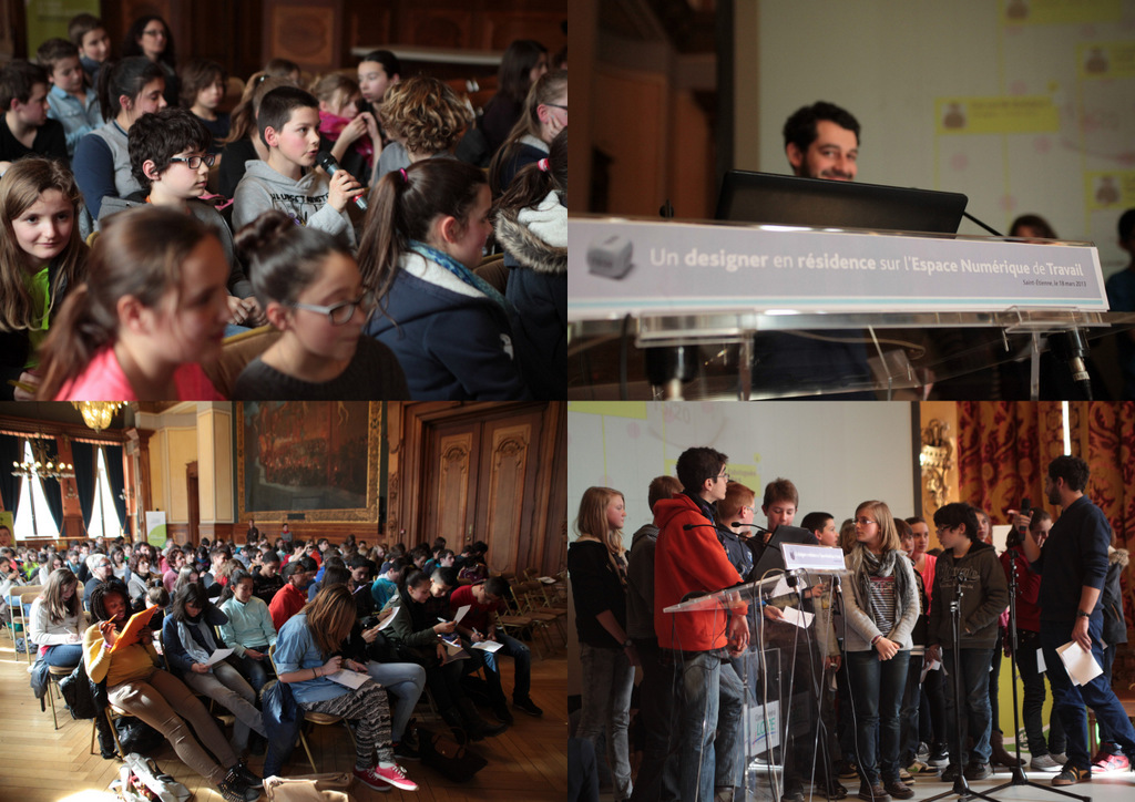 - Le 22 mars 2013, l’ensemble des classes ont été accueillies pour une séance de restitution et d’échange animée par Benedetto Bufalino dans les salons du Conseil Général de la Loire. En présence du Vice président en charge des collèges, de tous les intervenants du projet, des équipes du Cybercollèges42 et de laclasse.com, du PREAC Design et de la Cité.
