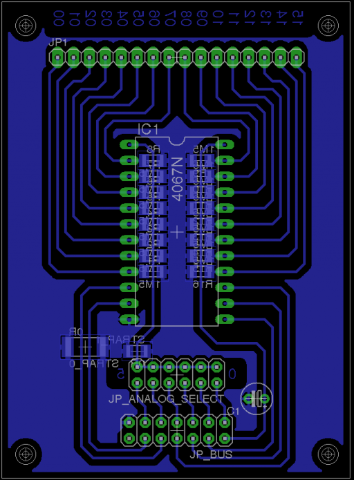Lorsque l’on a 60 entrées sur un circuit électronique, on est rapidement confronté au problème du routage des pistes de cuivre sur ce circuit, en particulier avec les contraintes que nous avons actuellement à ERASME : circuits simple face (sauf exception ou quelques pistes), pas de gravure de 0.4 mm (lire : "le pas de gravure"), circuit maximum de 80x100 mm (limitation logiciel CAD).