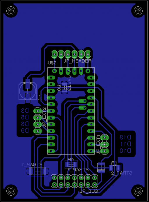 Le connecteur JP_BUS est coudé (en direction du bas de l’image), ce qui permet de faire passer une nappe HE10 14 voies de carte en carte. Au final, le circuit est très simple, aussi bien pour la carte mère que les cartes filles. Il est cependant envisagé à terme de remplacer la carte mère afin de piloter 60 ou 120 LEDs en PWM pour fournir un feedback visuel à l’utilisateur. Pour l’instant, cette tâche est confiée à un montage spécialisé concu par Interface-Z.