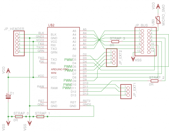 Pour plus de solidité, le header de l’Arduino pour le raccordement au PC/Mac est repris sur la carte, au lieu d’être utilisé directement depuis la carte Arduino.