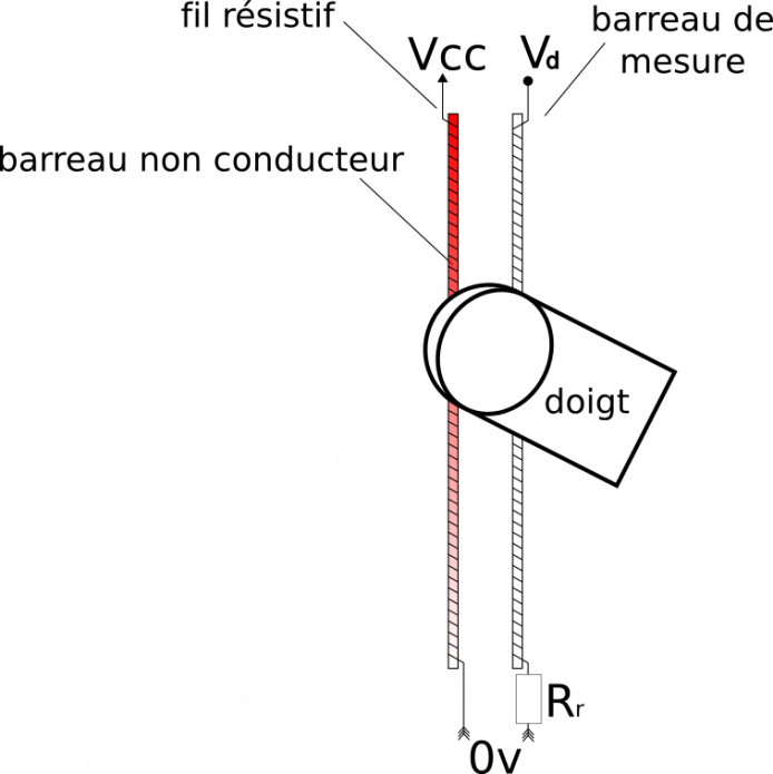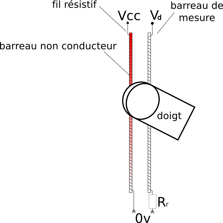 Lorsque l’on établit un contact avec le doigt entre le barreau alimenté et le barreau de détection, le potentiel électrique de ce dernier changera en fonction de la hauteur du doigt sur le barreau. Ce potentiel électrique sera mesuré et la hauteur de toucher pourra être calculée.