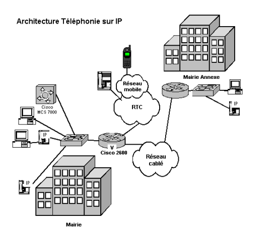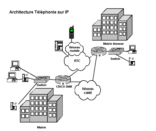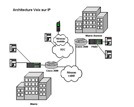 La liaison entre la passerelle voix et le réseau téléphonique peut être réalisée par une liaison RNIS de type E1 (30B+D) ou S0(2B+D). La liaison entre l’ancien PABX et l’opérateur téléphonique peut convenir si la mairie annexe n’a pas besoin de beaucoup de ressource téléphonique.
