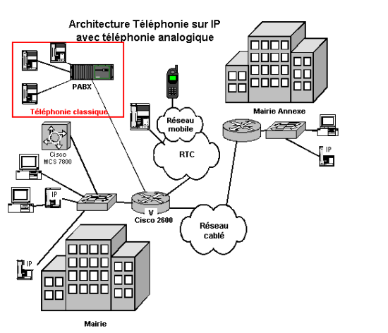 Le routeur Cisco 2600 dispose de fonctionnalités de passerelle voix (d’où le petit sigle V sur le dessin), pour que les appels hors du site puissent passer par le réseau téléphonique (RTC), il dispose aussi de fonctionnalités de Call Manager Express permettant de gérer en autonome jusqu’à 48 postes. Le 2600 peut être remplacé par le Cisco 1760 jusqu’à 24 postes et le Cisco 3700 jusqu’à environ 100 postes. Cet équipement remplace l’ancien PABX.
