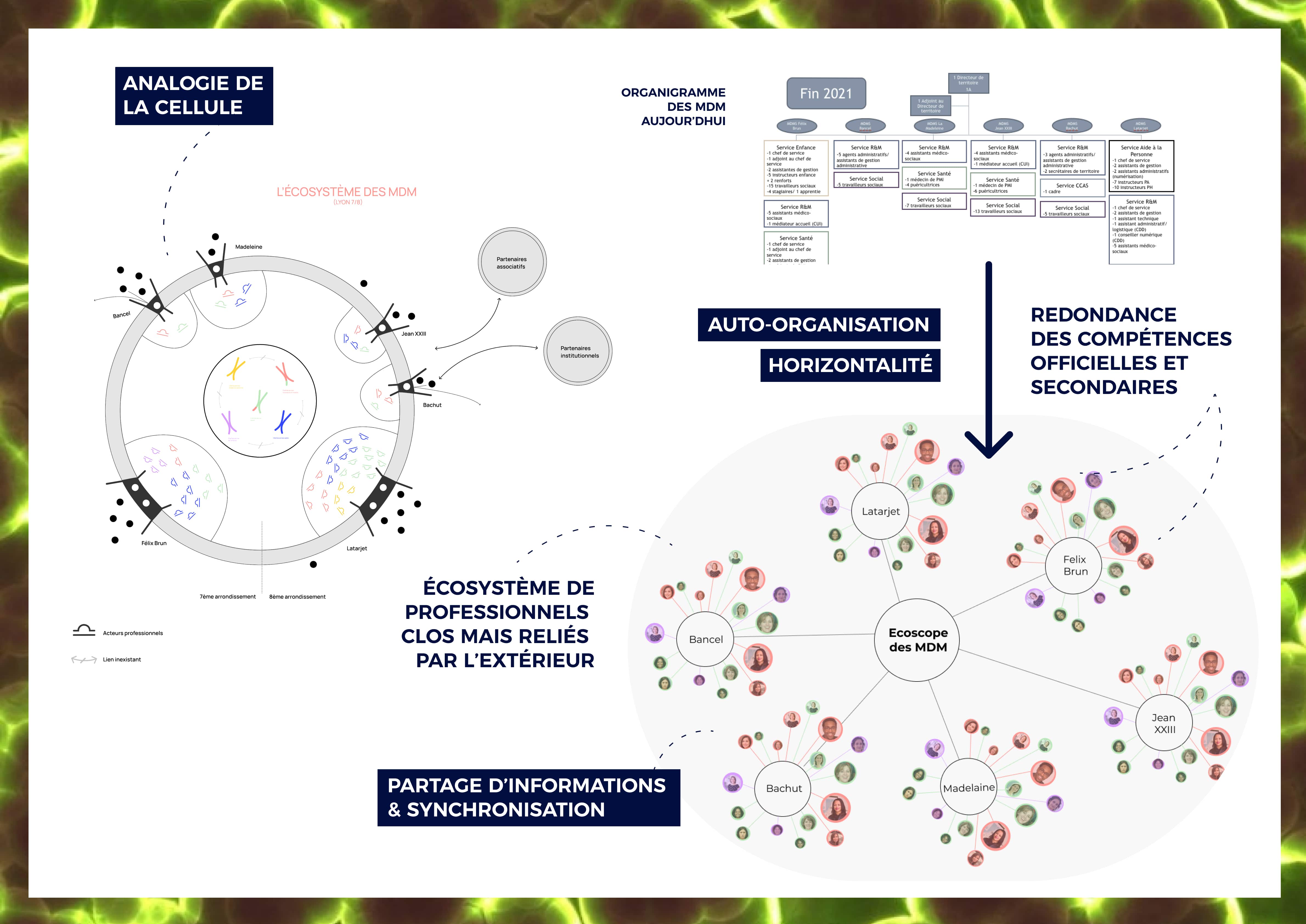 Sous forme de jeu, l’application propose un questionnaire sur la réalité quotidienne des professionnels au sein des MDMs. Chaque mois une affiche comportant ces renseignements est affichée dans un espace commun pour favoriser des liens.