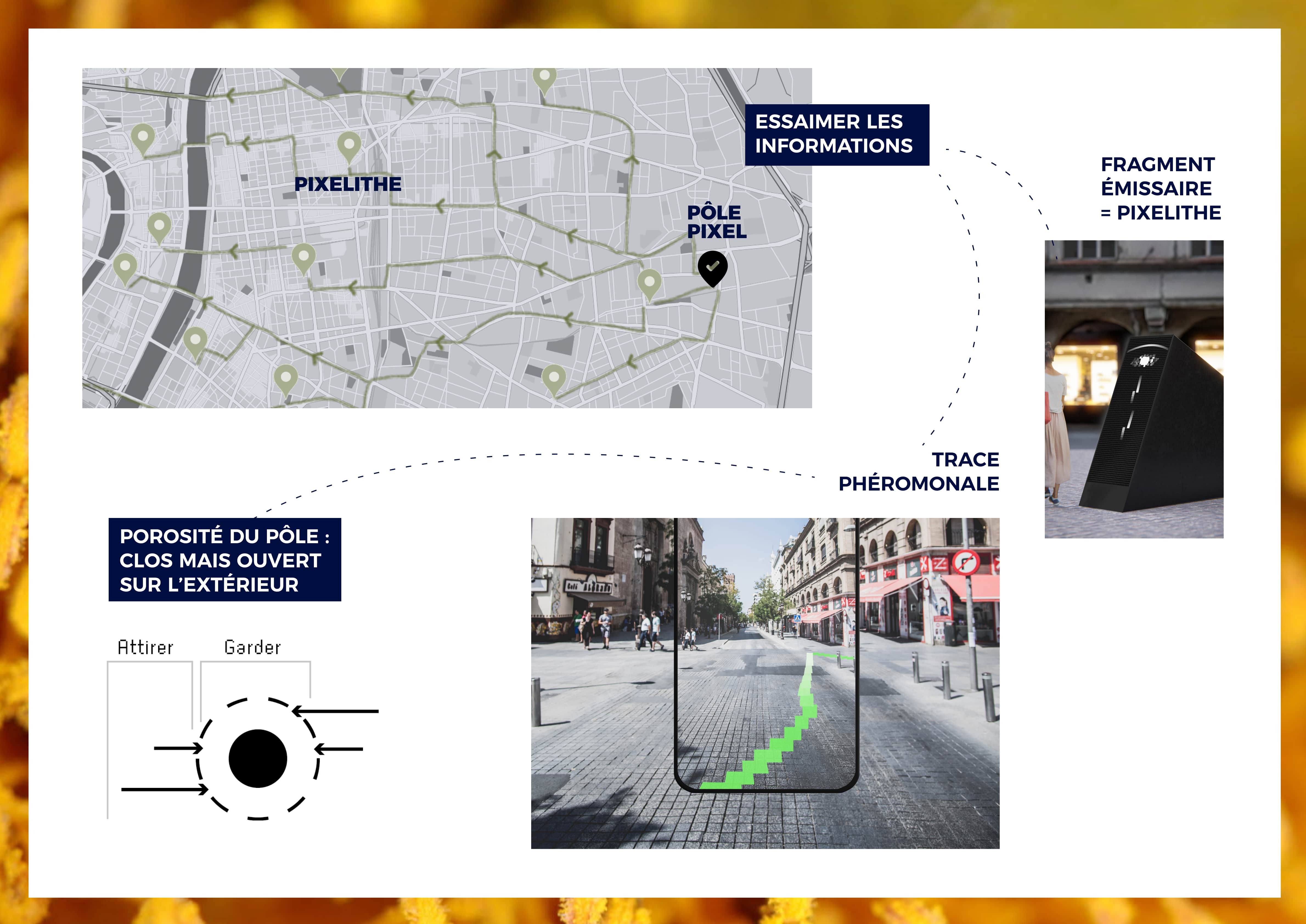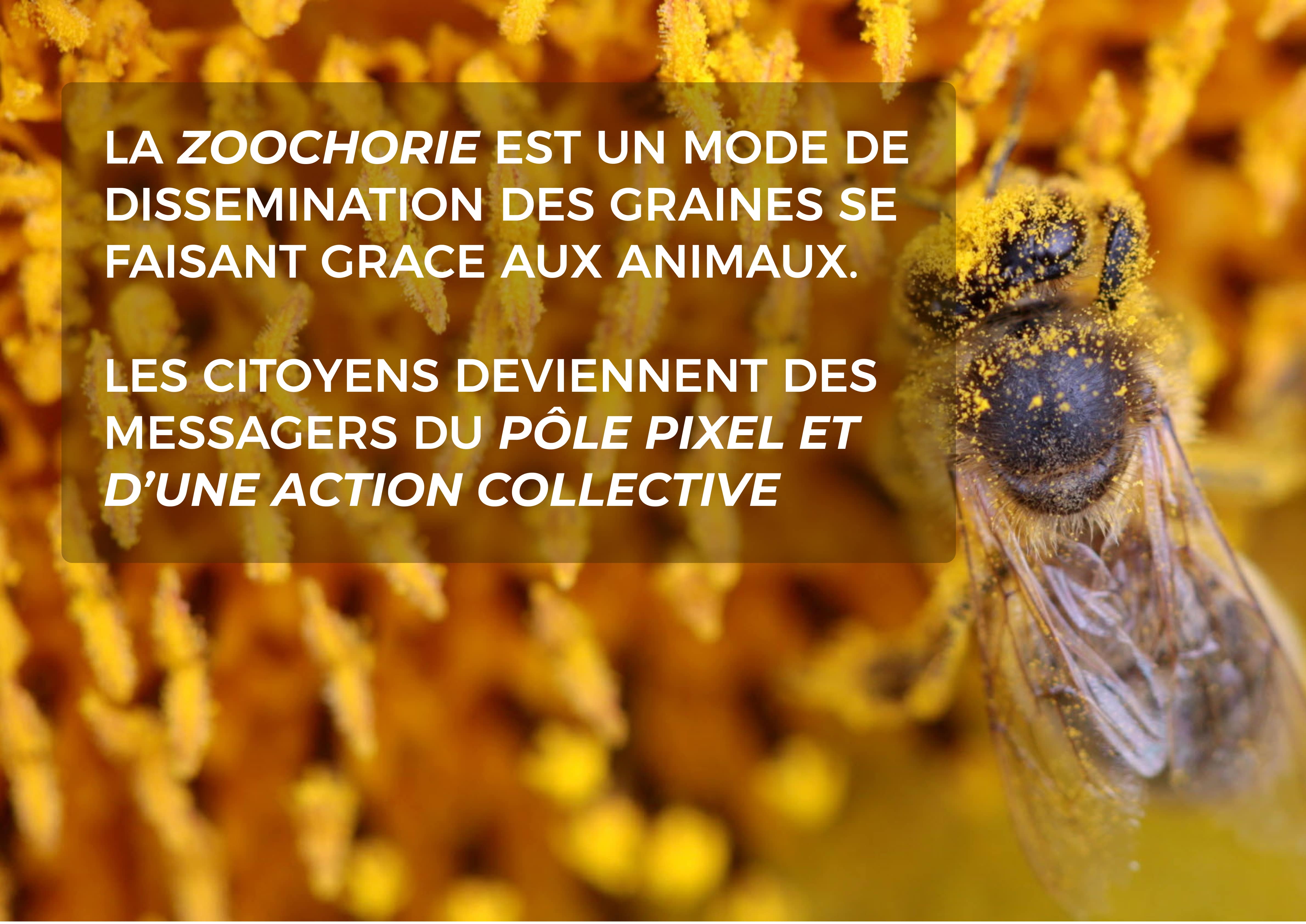 Ce dispositif reprend le principe de la zoochorie avec comme épicentre le Pôle Pixel et les pixelithes comme émissaires et porteurs d’information.