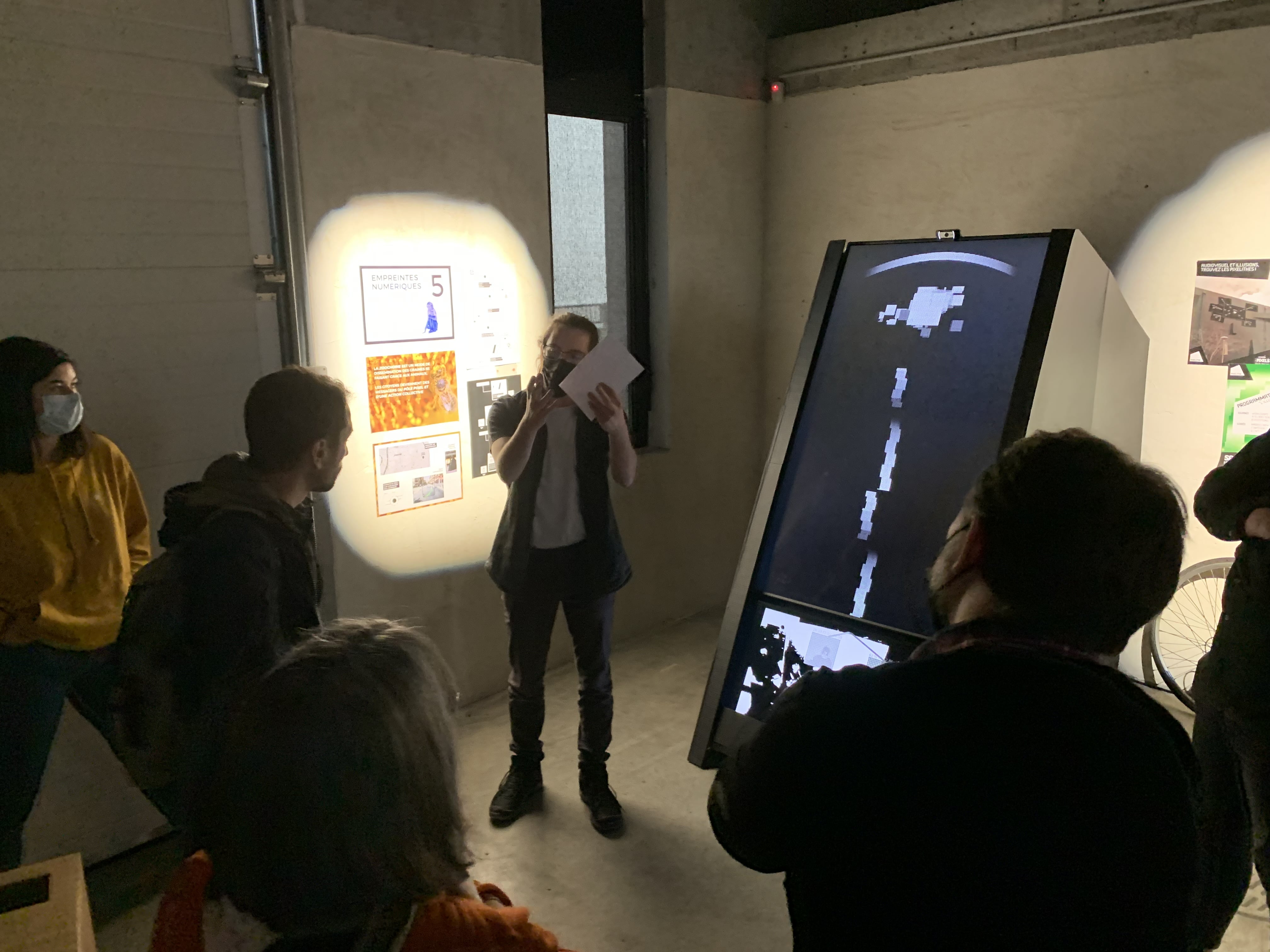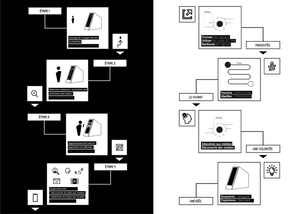 Un agglomérat de pixels représentera tous les acteurs et permettra via des connexions device de visualiser les présences au Pôle Pixel mais aussi en dehors, les utilisateurs étant éparpillés dans la ville dans une sorte de dépassement de la frontière physique.