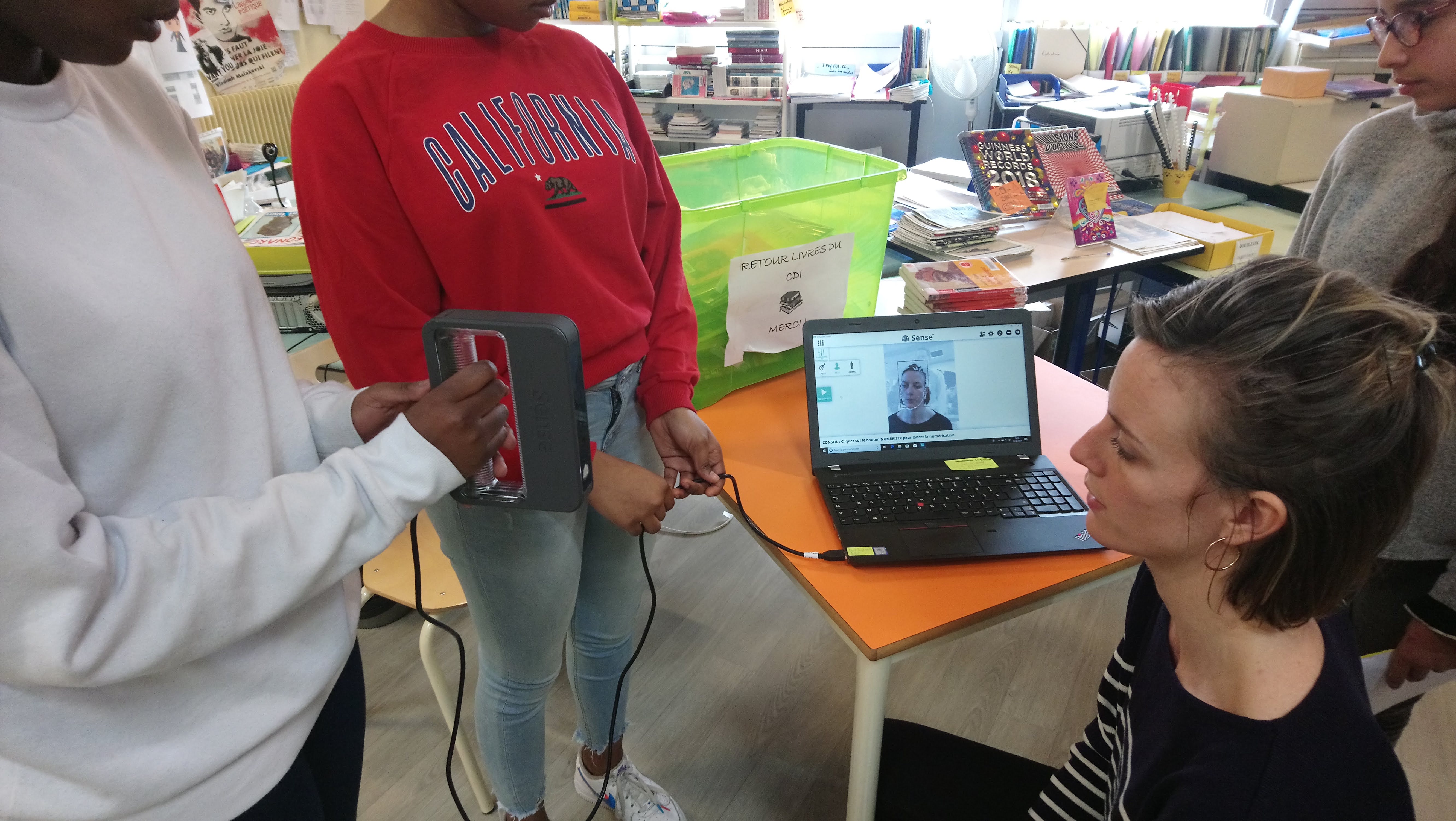 Les visites sont l’occasion pour l’équipe des Subsistances de présenter ce lieu culturel singulier. Cette structure culturelle accueille en effet le projet d’Anne-Sophie Grac en résidence. C’est là qu’elle prépare son spectacle et qu’elle échange avec l’équipe. C’est aussi un moment de travail organisé par le Labo NRV, un laboratoire du numérique co-géré entre les Subsistances et l’ENSBA, l’école des Beaux Arts de Lyon. Célia, la coordinatrice du Labo NRV va faire découvrir le scanner 3D aux élèves qui vont pouvoir scanner Noémie et découvrir l’intérêt de la technique.