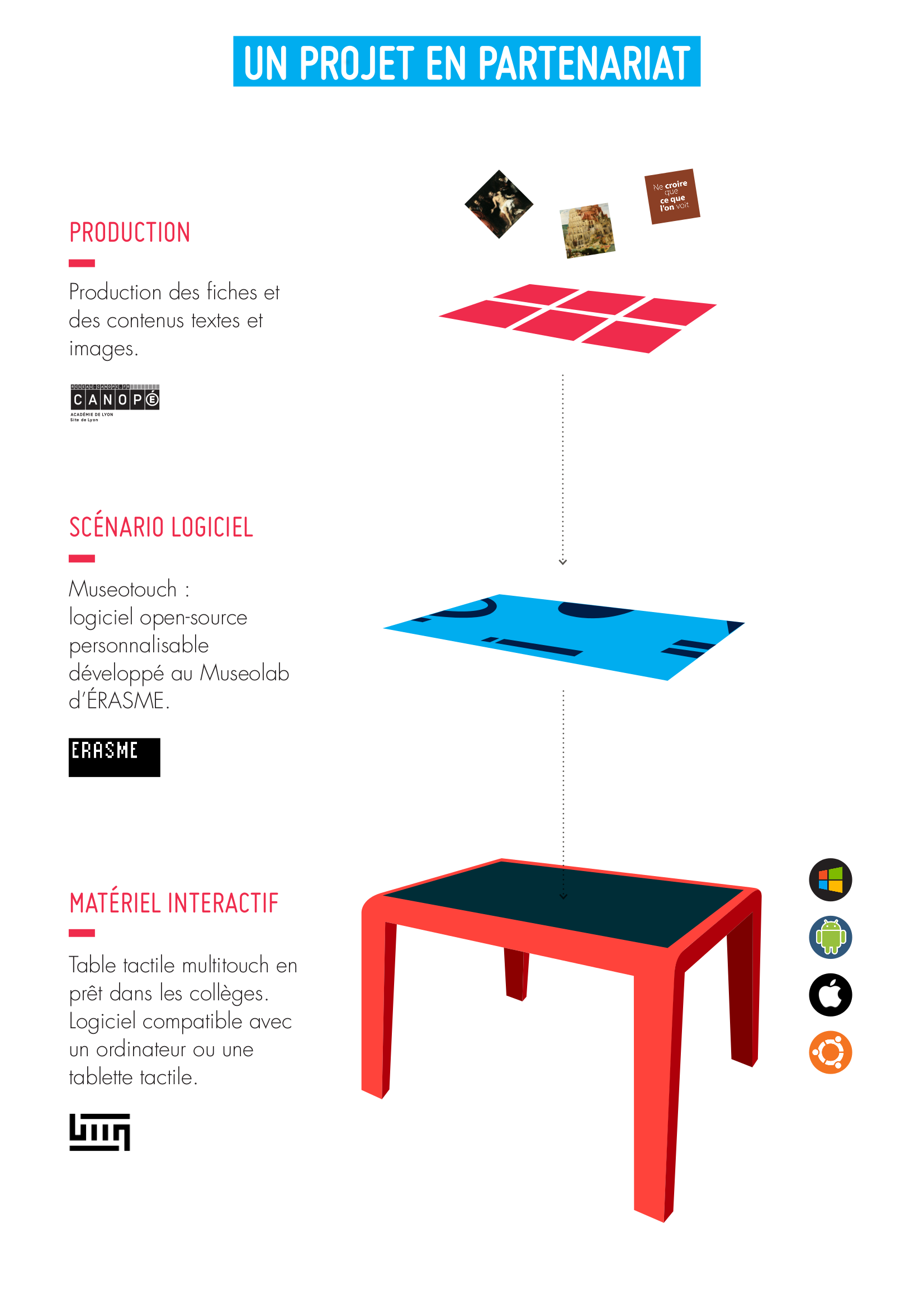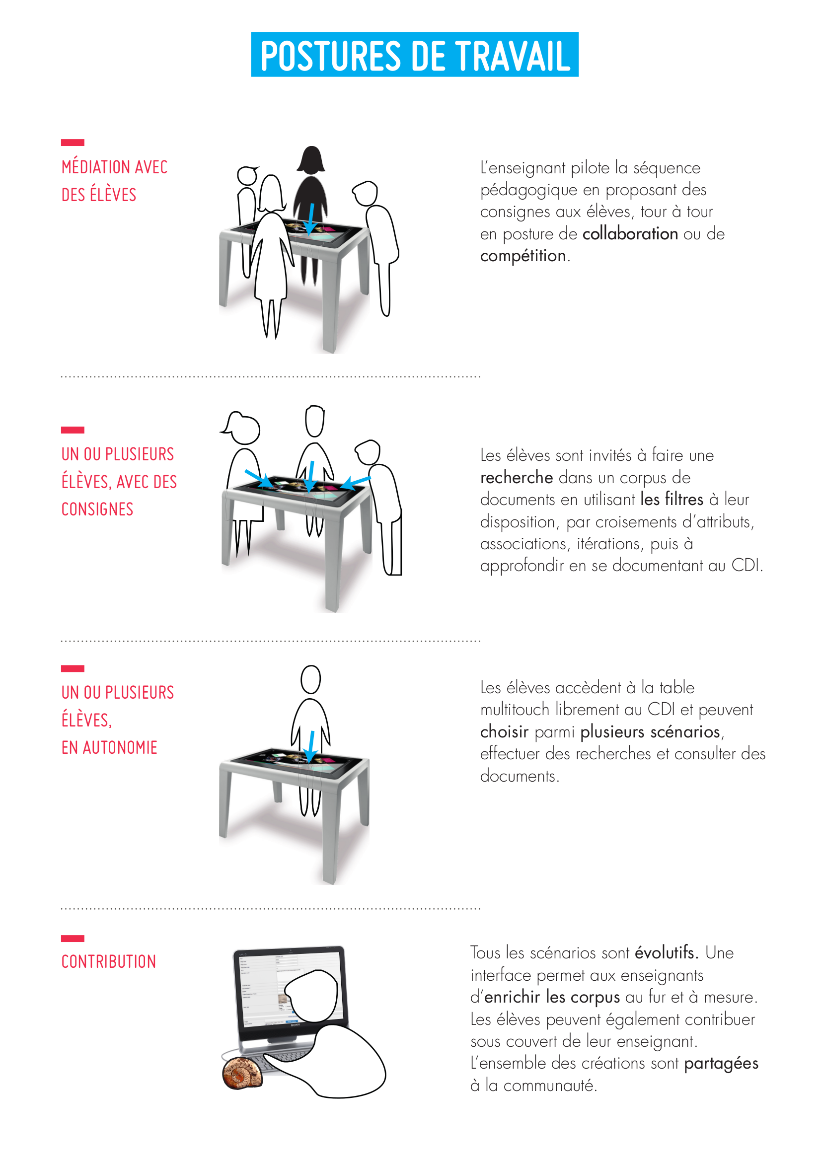 - évaluer la pertinence d’une table tactile en situation d’apprentissage afin de préfigurer les futurs espaces 3C (Centres de Connaissances et Culture) comme lieu d’expérience et d’enseignement