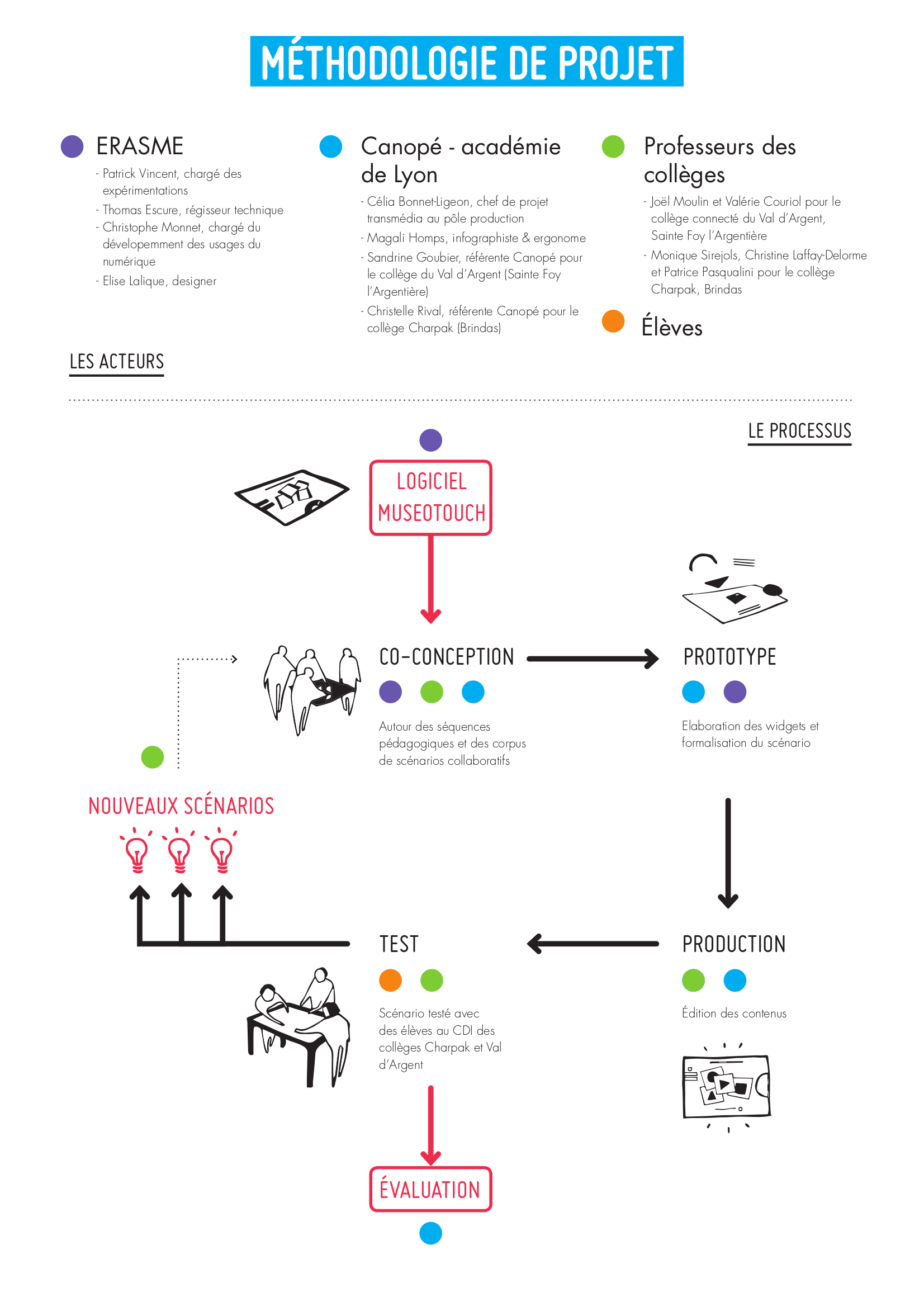 En charge de l’accompagnement des usages dans le département, la DANE et le pôle production de Canopé (Académie de Lyon) ainsi que le centre Érasme (Département du Rhône) ont proposé aux enseignants et documentalistes volontaires de transposer un outil muséotouch opensource, initialement destiné aux musées en utilisant une méthode de production collaborative et agile.