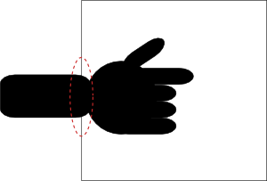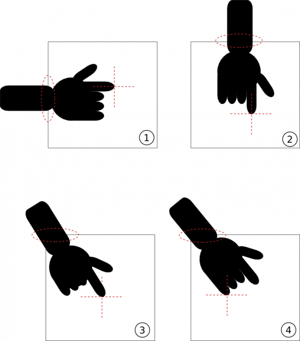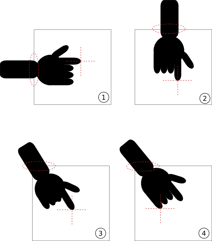 En revanche, le cas 4 pose problème. En effet, il est réduit au cas 2 (plus grande occlusion au Nord) mais le positionnement de la main et le sens du parcours font qu’un mauvais point est déterminé (auriculaire replié au lieu de l’index). Il faudra modifier l’algorithme pour déterminer non pas l’ordonnée (ou l’abscisse) la plus éloignée d el’occlusion, mais le point le plus éloigné géométriquement. En effet, si l’on trace un cercle centré sur l’occlusion, on remarquera que le point à la plus grande distance du cercle est systématiquement le point recherché. Ce raffinement sera introduit ultérieurement.