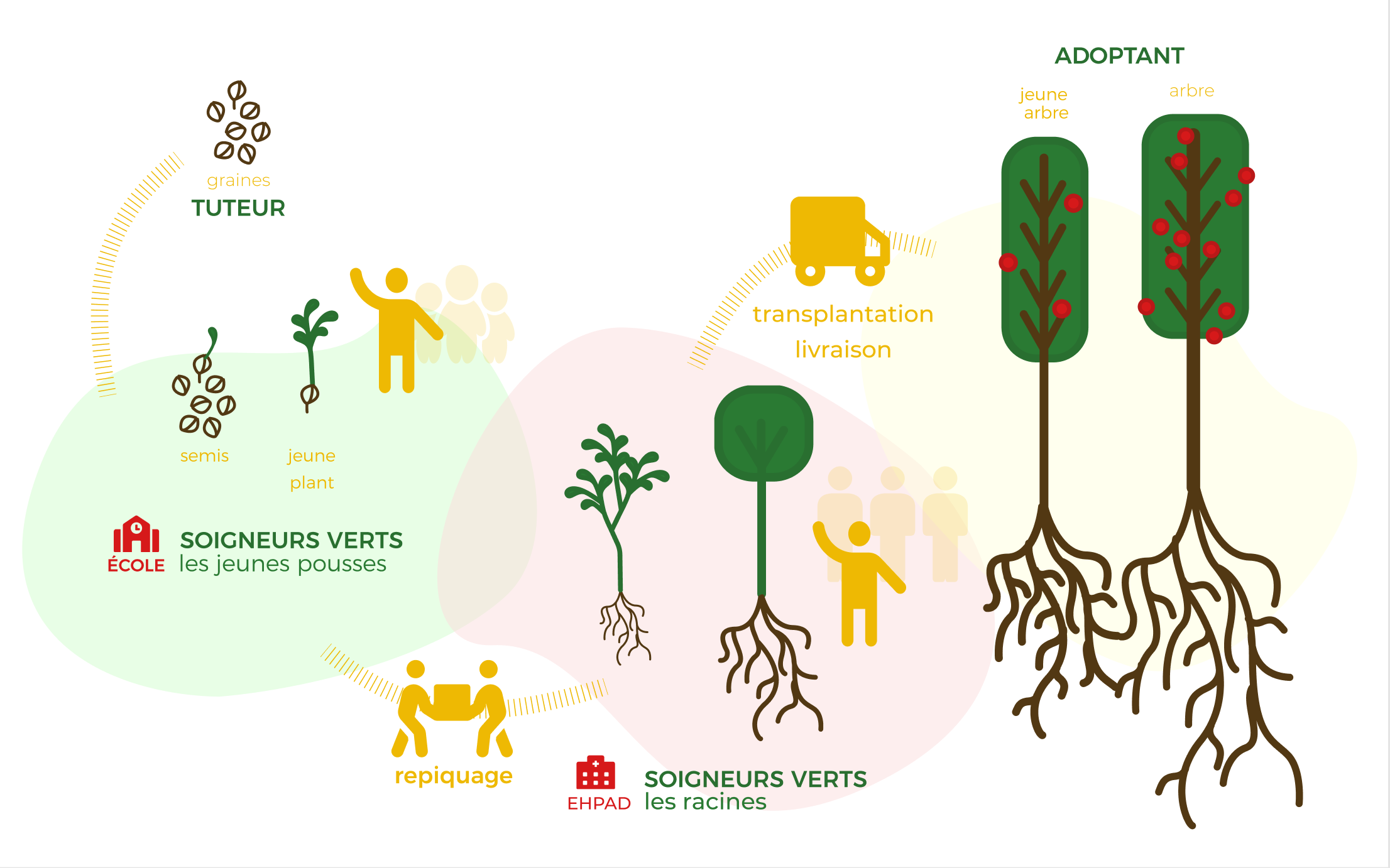 Des soigneurs verts (une école, un Ehpad, un lycée privé, un particulier,...) signent la convention et s’engagent en accueillant des graines ou des jeunes pousses à s’occuper. Ces premieres pousses sont en suite transmis à d’autres soigneurs verts lors de la cérémonie de passation, disposant d’un terrain pour que les racines de ces jeunes arbres puissent grandir. Une fois que ces jeunes arbres sont devenus vigoureux, ils pourront prendre place chez leurs adoptants définitifs (entreprises, hôpitaux, collectivités) désireux de voir ces arbres portés par la communauté prendre place sur leurs terrains.
