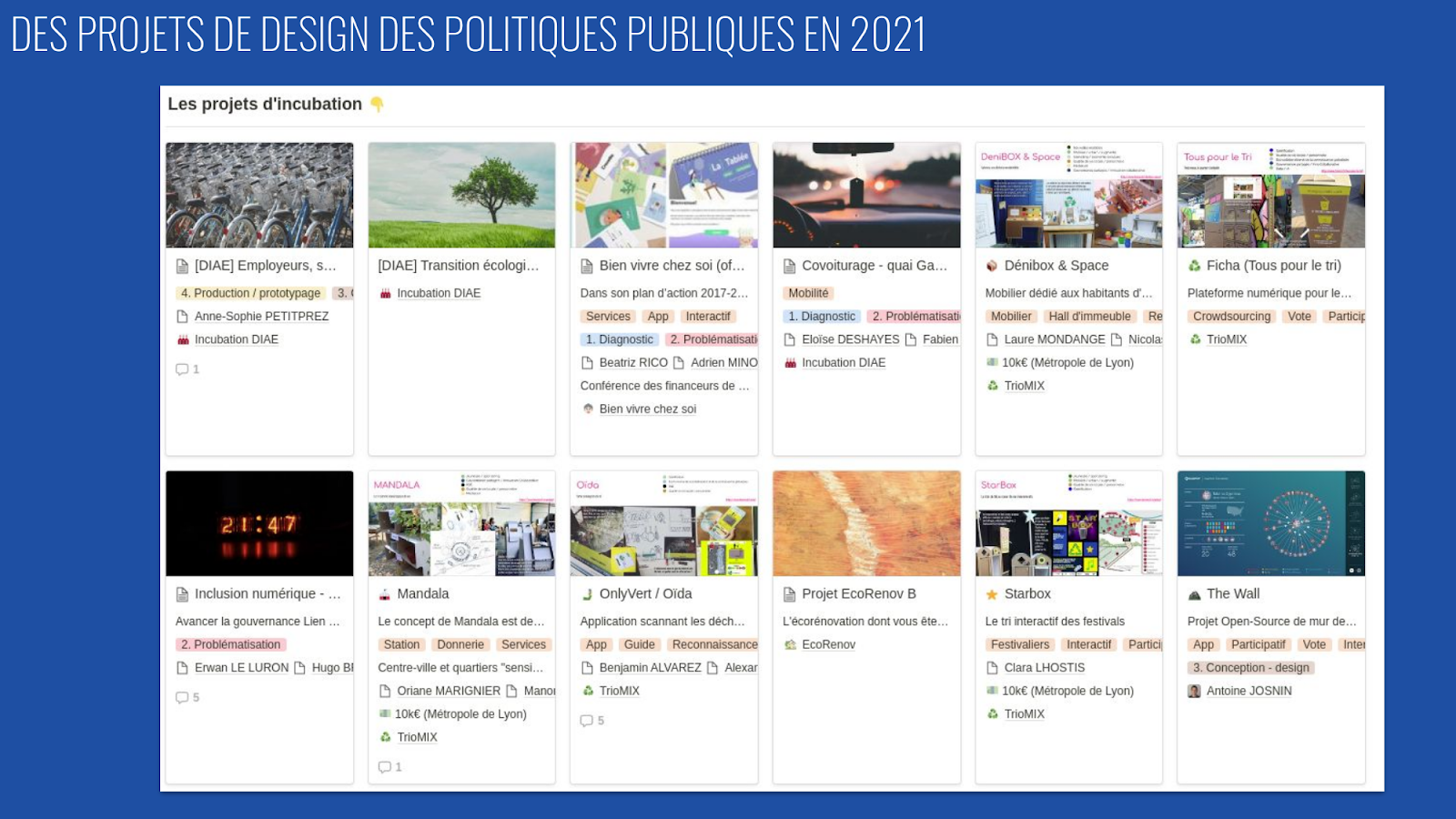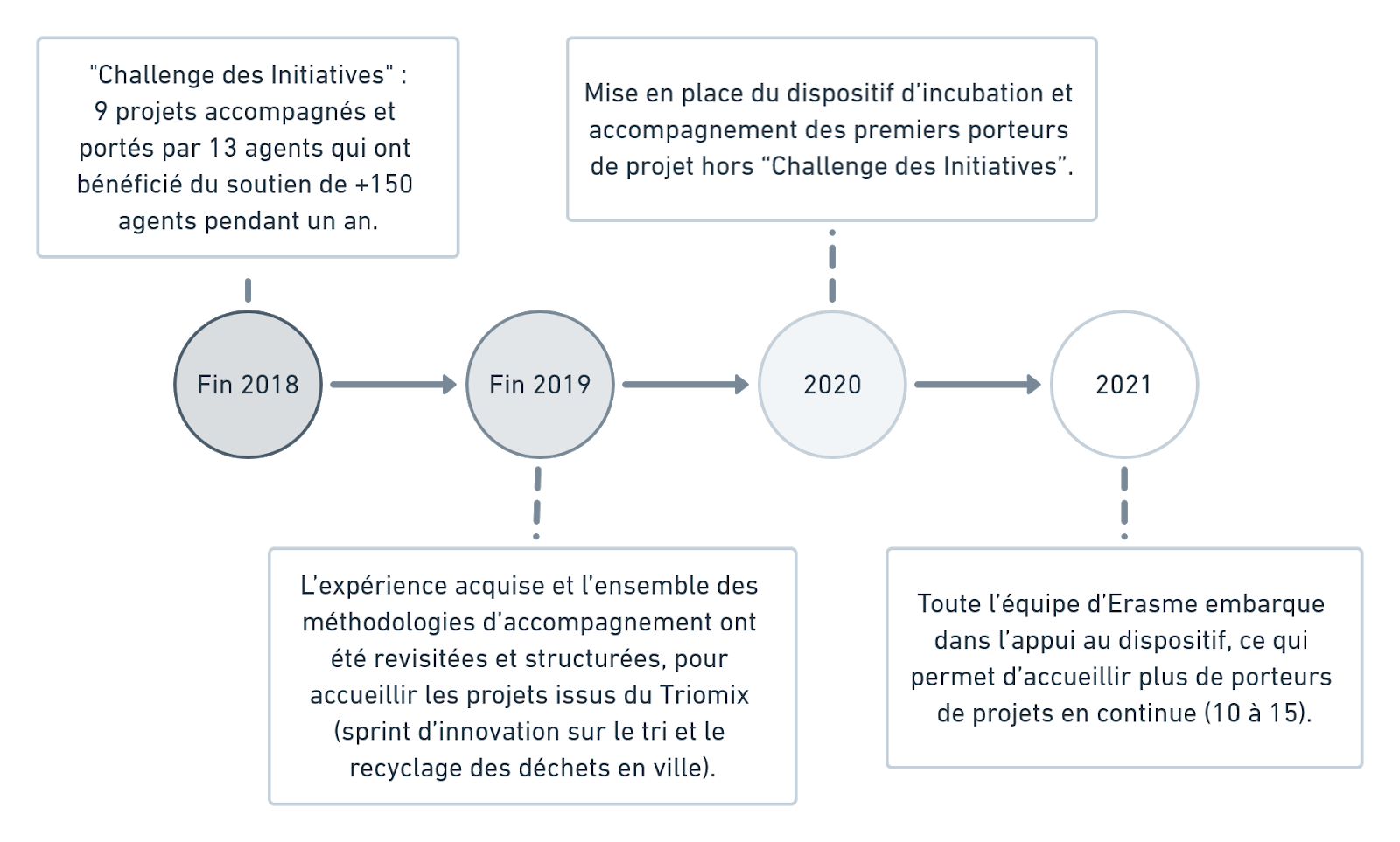 Depuis, Erasme a poursuivi l’accompagnement de porteurs de projets internes issus de plusieurs directions métiers, permettant au service de renforcer ses méthodes et moyens pour structurer une offre d’incubation adressée à tous pilotes d’innovation de la métropole et à ceux issus de mix/sprints d’innovation (pouvant être externes).