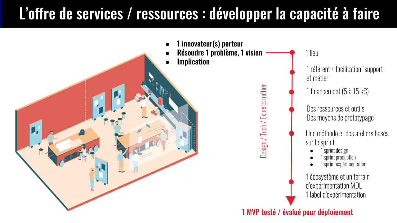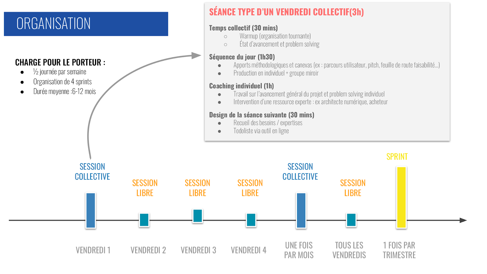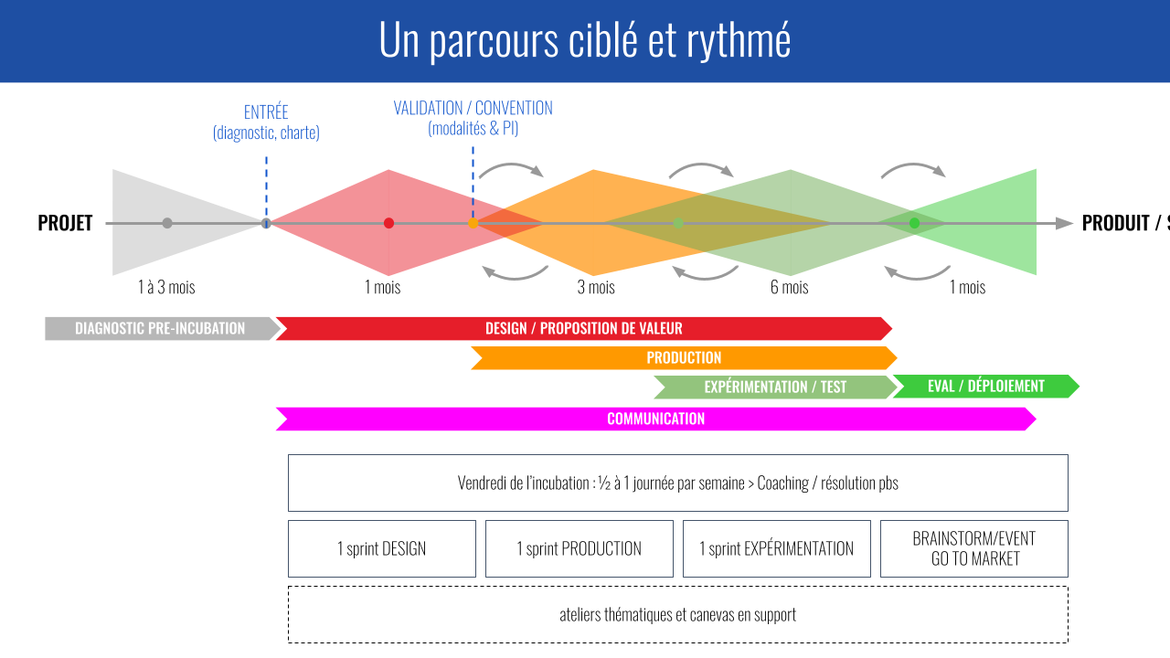 Les porteurs de projet peuvent ainsi s’en saisir en structurant leurs projets par des ateliers / sprints d’innovation (conception, production, préparation expérimentation, modélisation) qu’ils conduisent eux-mêmes, temps forts des étapes à franchir. Ils sont ainsi outillés et accompagnés par l’incubateur dans cette mise en œuvre de jalonnement collectif de leurs réalisations.