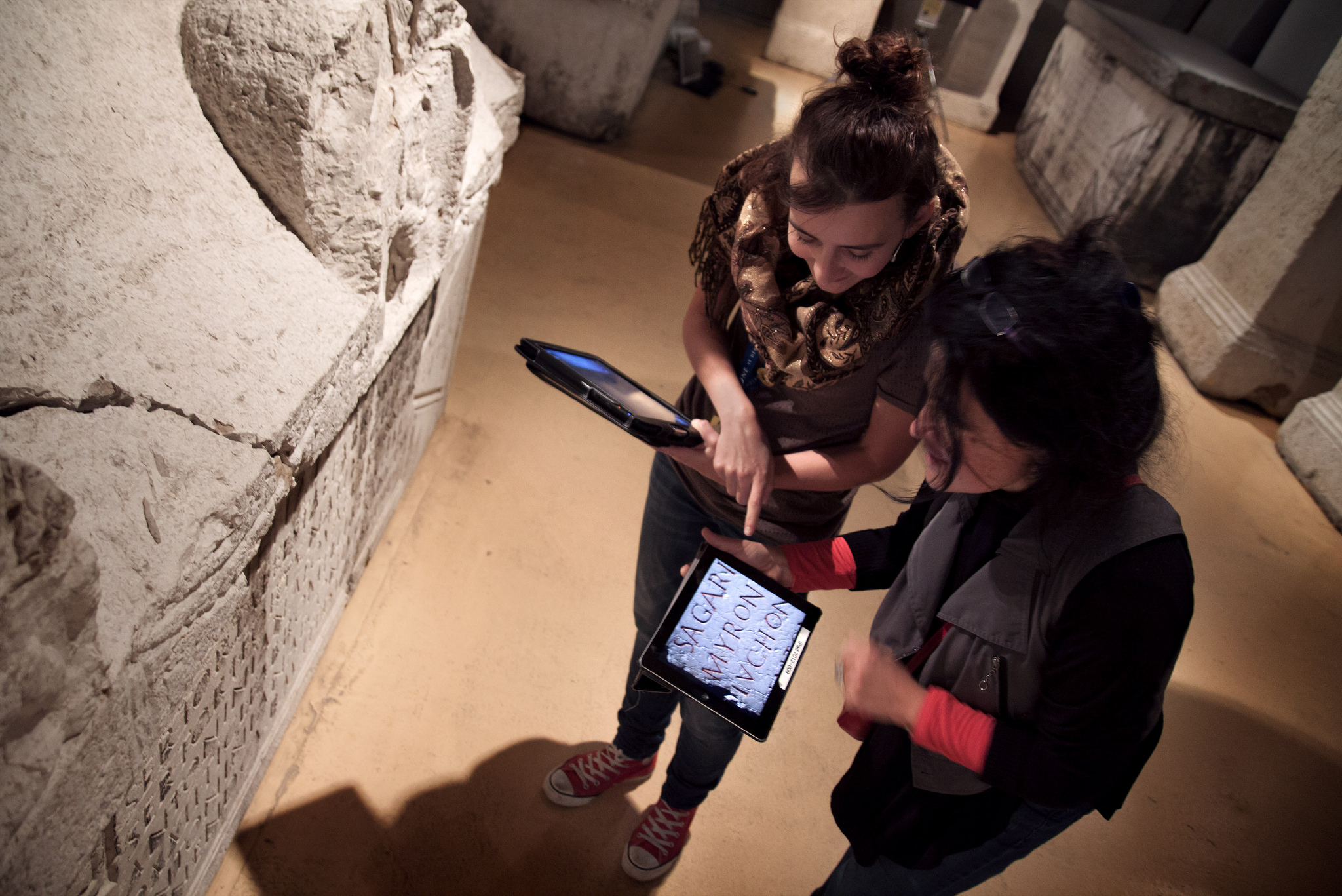 Ce projet visait à produire un jeu sur tablette, fil rouge de l’ensemble de l’exposition. En pratique la “visite dont vous êtes le héros” concernait principalement la salle des artisans et commerces. L’équipe de visiteurs (3 personnes) se voyait confier la mission de produire et commercialiser leur cargaison de « vinum », chacun recevait pour cela une tablette tactile (Android 10 pouces). Ces appareils numériques fonctionnaient en réseau et nécessitaient la coopération des joueurs pour accéder à des indices et atteindre l’objectif final de la mission. Il s’agissait de résoudre ses propres énigmes/questions tout en état attentif à ses coéquipiers. Les différentes activités numériques proposées facilitaient la découverte du monde artisanal du IIe siècle. Certaines étapes du jeu utilisaient le corps des participants comme repère spatial.