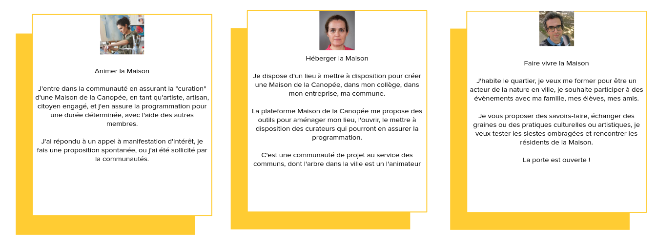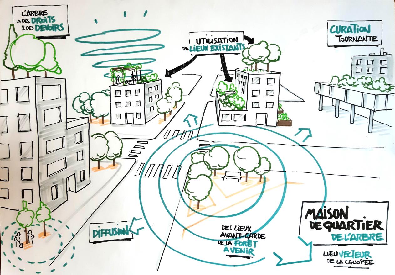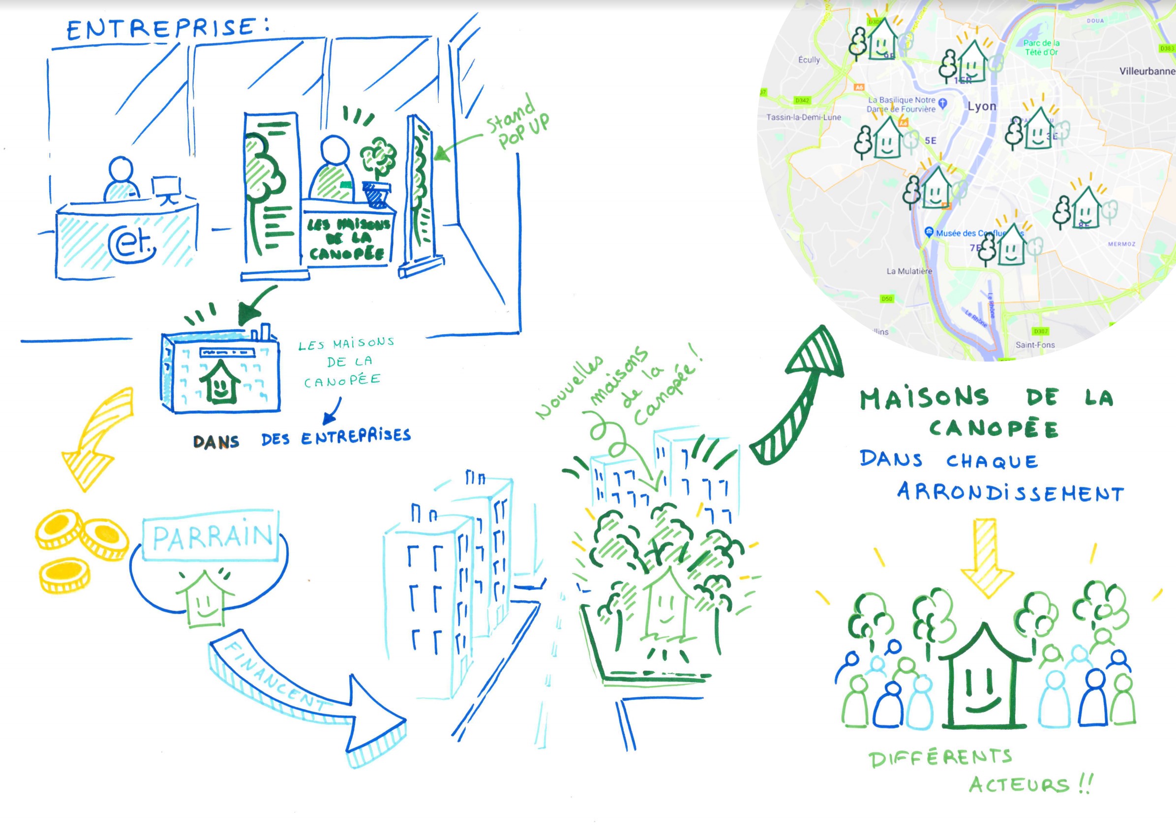 Étant donné que ces maisons ne peuvent se construire en un temps restreint, le projet peut d’abord prendre vie dans des espaces inoccupés, des écoles, des terrains abandonnés temporairement, ou encore au sein de diverses entreprises comme dans un Hall. Les entreprises peuvent jouer un rôle important car grâce à des installations pop up, les maisons de la canopée pourraient sensibiliser les salariés ainsi que leur public. Grâce au parrainage de ces entreprises, la Maison de la Canopée aurait la possibilité de se déplacer pour se construire dans chacun des arrondissements de la ville. Le but final est d’attirer différents membres que ce soit des artistes, des associations, des citoyens, des entreprises, ou encore des ong.