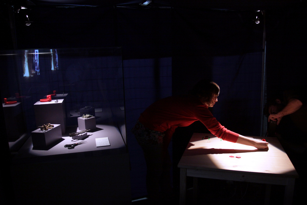 La mise en espace présentait l’intérêt d’un espace confiné et protégé, attirant la curiosité, mais la manipulation des objets dans un recoin, dos aux projections, ne donnait pas un bon point de vue sur les audiovisuels et rajoutait un côté artificiel à l’interaction.