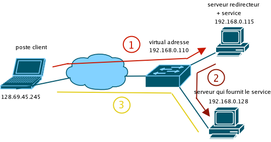 L’adresse virtuelle vu par le client sera 192.168.0.110 et elle servira à accéder au service daytime qui sera traité soit par 192.168.0.115, soit par 192.168.0.128.