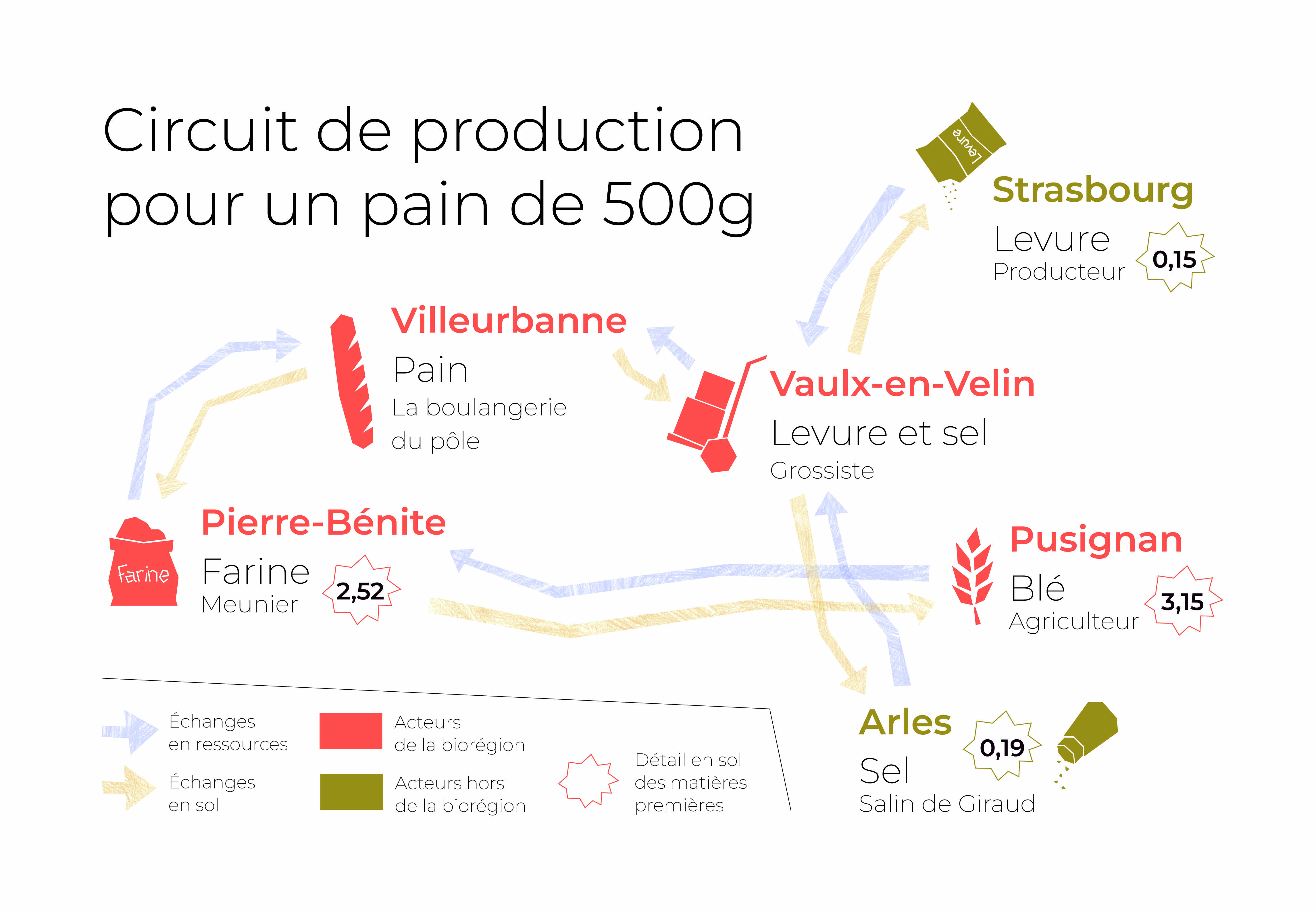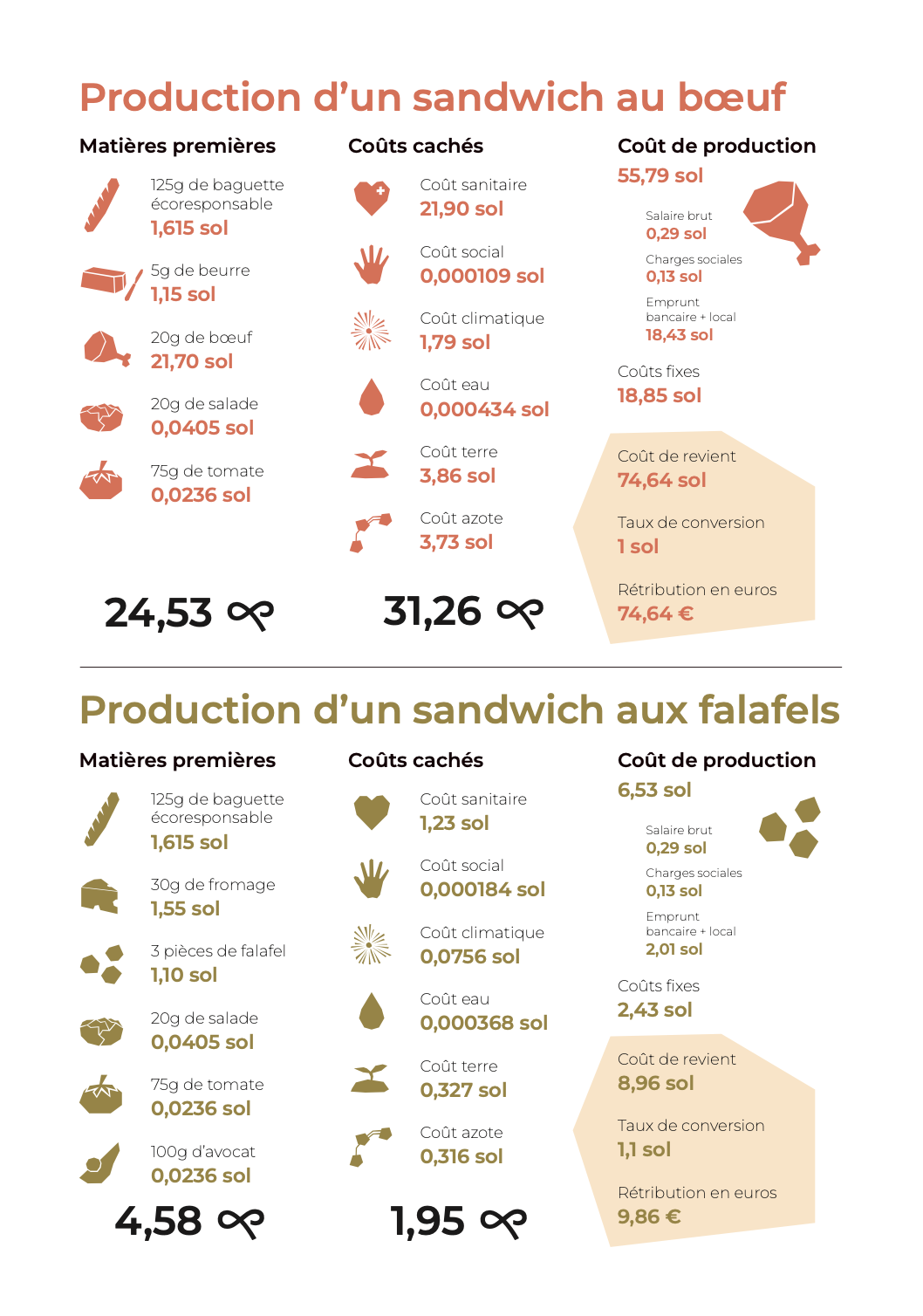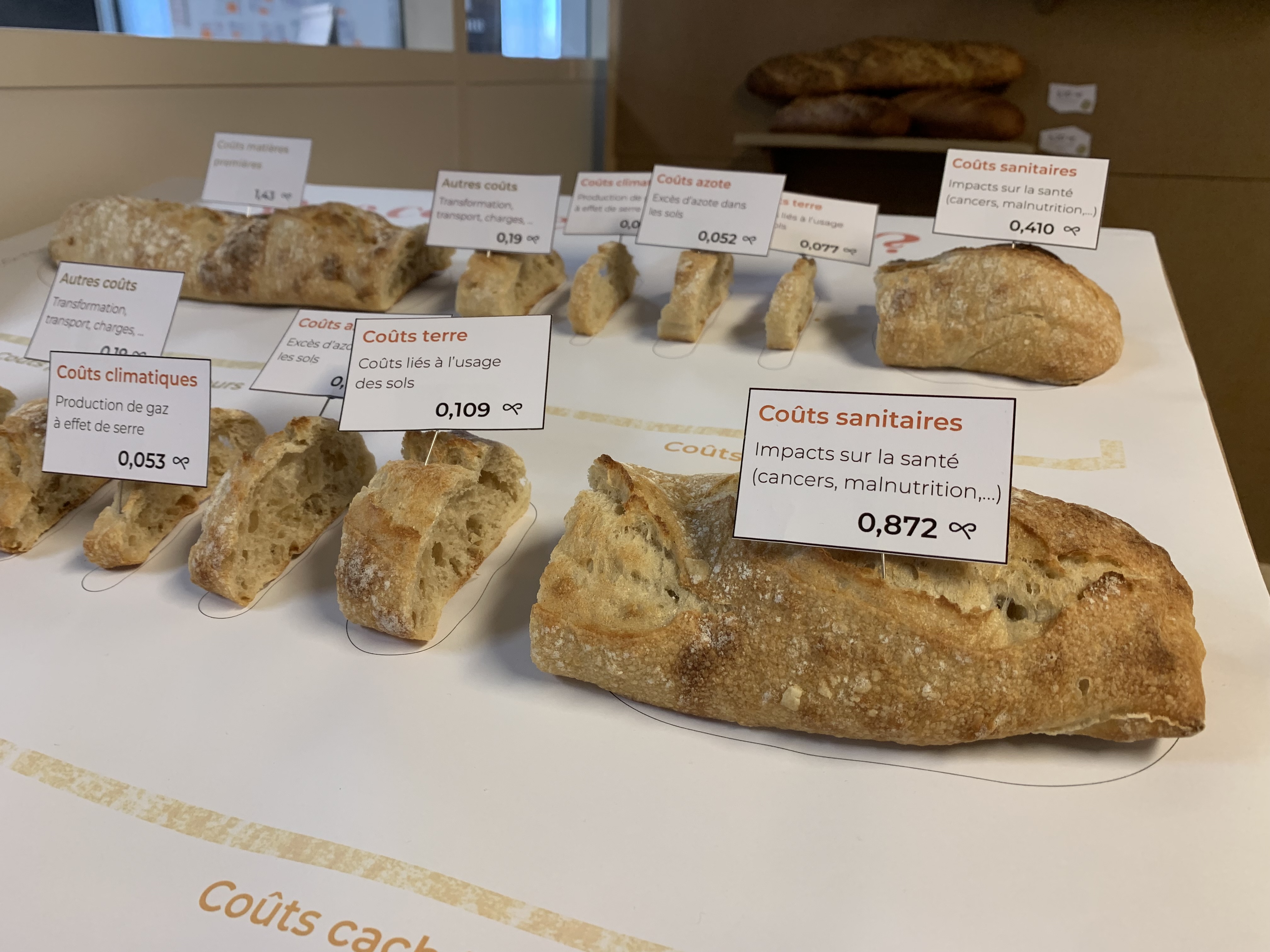 Ainsi le pain bio a un prix très proche du pain pétrochimique. Mais les coûts sont répartis de manière très différente : dans le cas du pain bio, plus des 2/3 du prix reviennent aux producteur·ices, contre moins de la moitié dans le pain pétrochimique. Le pain pétrochimique intègre en sol des nombreux coûts habituellement cachés et non pris en compte : coût sanitaire, coût climatique… Ces coûts cachés sont estimés à plus de 177 milliards d’euros par an en France (source Organisation des Nations unies pour l’agriculture et l’alimentation : https://www.fao.org/interactive/state-of-food-agriculture/fr/). La sol prend donc non seulement en compte le coût énergétique solaire mais aussi les coûts cachés des impacts de production à court et long termes.