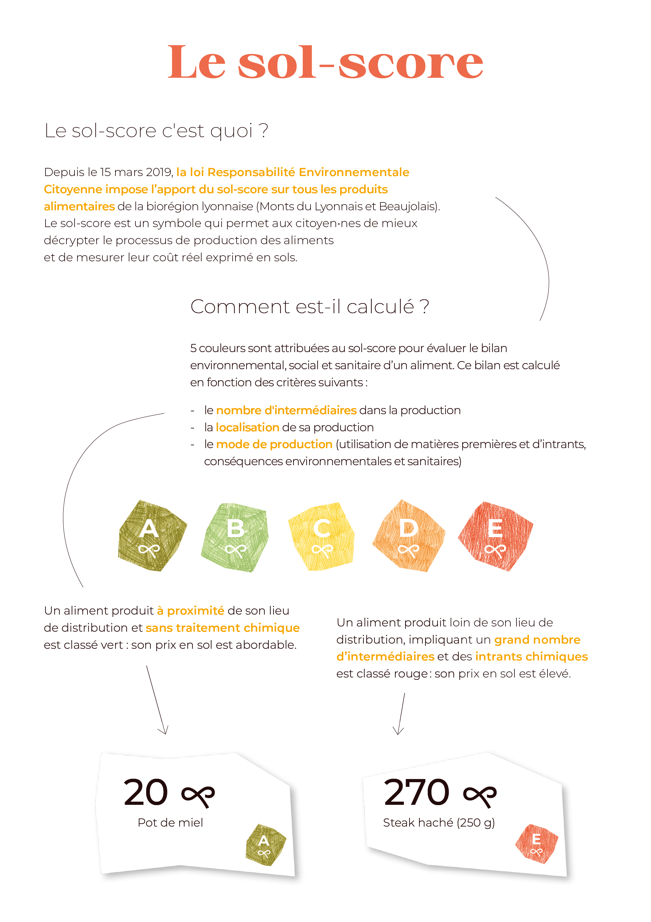 De plus, sur les étiquette de prix des produits est apposé un sol-score qui permet aux citoyen·nes de mieux décrypter le processus de production des aliments et de mesurer leur coût réel exprimé en sol.