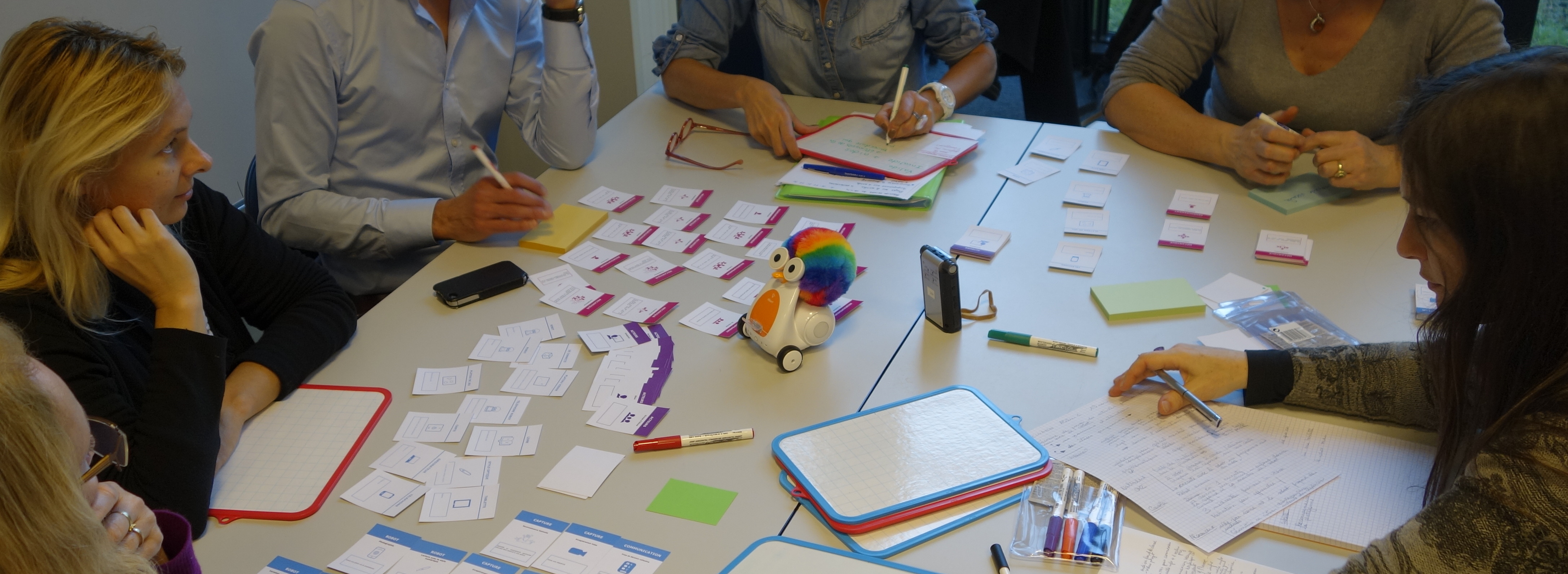 Le 21 janvier, à l’institut français de l’éducation. Atelier de créativité avec des enseignants de primaire sur l’utilisation d’objets connectés (Robots, dés, tablettes) pour enseigner les mathématiques d’une manière renouvelée. Ces ateliers participent au projet Ocinaéé, financé par les investissements d’avenir, qui réunit l’Ifé, Awabot, Digischool et Erasme.