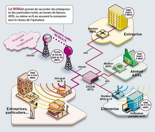 Apparu en janvier 2003, Wimax (Worldwide Interoperability for Microwave Access) est le nom commercial de la technologie sans fil 802.16 pour l’accès au réseau de l’opérateur, comme Wi-Fi (Wireless Fidelity) est celui de 802.11. Cette technologie pour opérateurs s’avère plus performante et plus solide que Wi-Fi. Son domaine d’action est le réseau métropolitain et plus spécialement le « dernier kilomètre » , c’est-à-dire entre le central de rattachement et l’abonné. Il est prévu pour fournir des services de type DSL, liaison louée et le raccordement de réseaux radio publics.