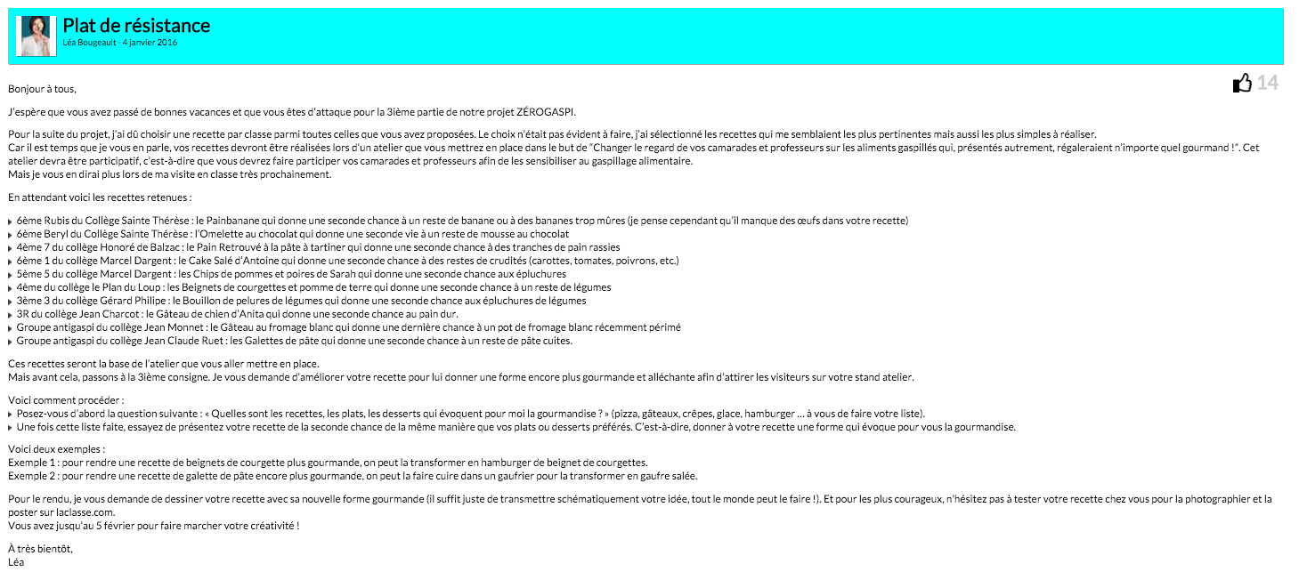Chaque fois que Léa publie une consigne, les élèves en prennent connaissance en classe puis effectuent le travail et le postent sur le site. Tout le monde en a alors connaissance, les discussions et les commentaires s’affichent à la suite.