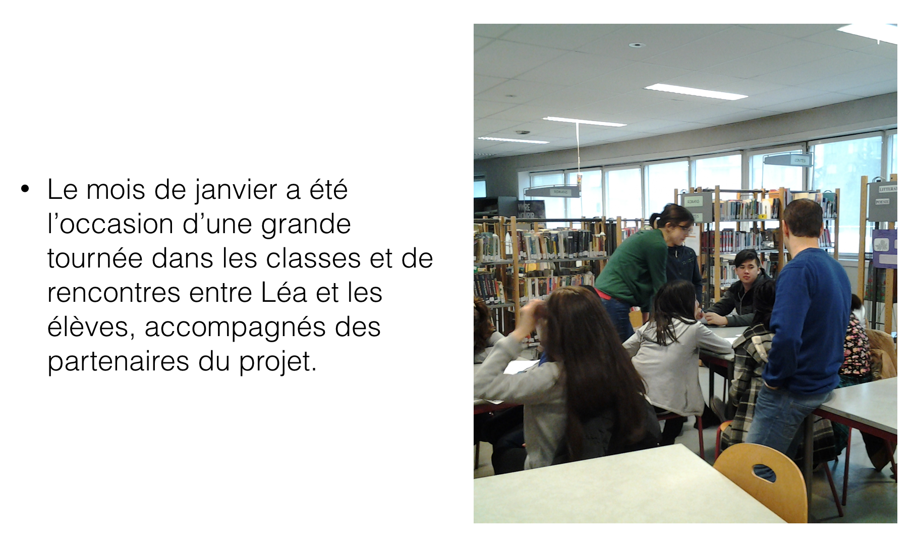 Une formation des enseignants a eu lieu en septembre, à cette occasion ils ont rencontré Léa et tous les intervenants, nous leur avons proposé la méthodologie mise en oeuvre durant l’année scolaire, établi le calendrier des publications et défini les dates des rencontres dans les classes et de la rencontre publique de fin de projet.