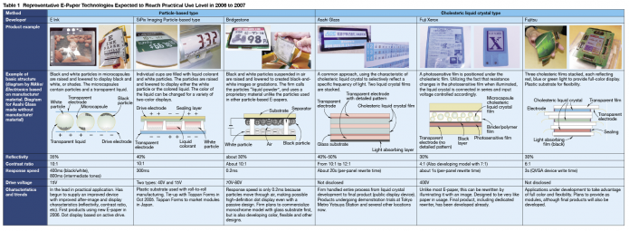- de papier : Hitachi, Fujitsu, Matsushita, Philips, Sipix, Plasticlog, PVI, Toppan