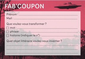 A partir de textes, de phrases créées sur place, le FabCoupon à la main, 200 personnes sont allé rencontrer l’équipe du Fablab pour réaliser un objet, prétexte à la rencontre avec les découpes vinyles ou laser, l’imprimante 3D, la machine à dessiner, une véritable usine dans une cuisine, qui a permit de réaliser les projets les plus fous. 10 nouvelles ont été écrites par une cinquantaine d’auteurs différents.
