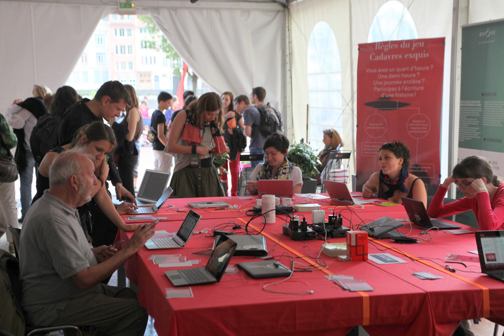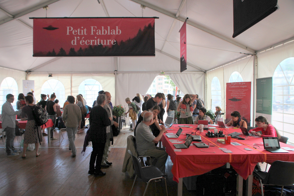 Un espace de 80m2 a été aménagé sous la tente des libraires, permettant durant deux jours d’accueillir les visiteurs. Plusieurs médiateurs étaient présents afin de guider les écrivains en herbe ou les auteurs confirmés dans une démarche qui débutait par une écriture collaborative, à la suite de prologues proposés par Léonora Miano ou Maylis de Kerangal.