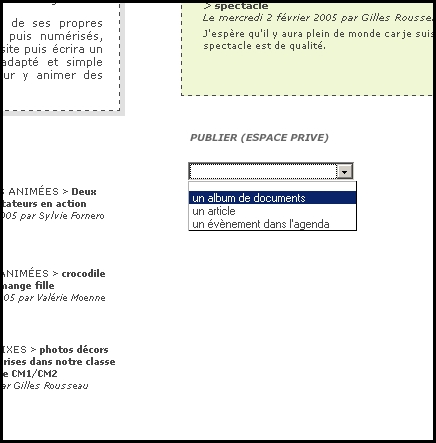 Sur la page d’accueil du site, se rendre dans le menu "PUBLIER (espace privé)" situé à droite sous les dernières actualités de forum, et choisir "un album de documents". Si ce n’est déjà fait, s’authentifier avec vos login et mot de passe précédents.
