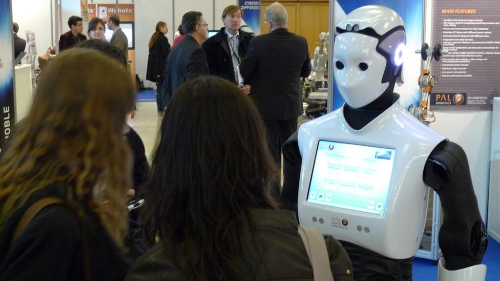 On croise aussi à Innorobo de nombreuses bornes interactives mobiles, invitant le visiteur à cliquer sur un écran pour obtenir des informations, et à suivre la machine afin de découvrir l’emplacement où se trouve le produit proposé.