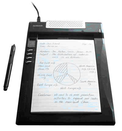 Si recopier des notes sur votre ordinateur vous rebute, le DigiMemo pourrait s’avérer être une bonne solution ! Ce périphérique reste extrêmement simple dans son concept. Il s’agit d’une tablette au format A4 sur laquelle l’utilisateur prend des notes comme sur un bloc-notes. Celles-ci sont stockées dans la mémoire non volatile de la tablette et peuvent être exporté sur un PC sous différents formats (e-Book, fichier graphique...) via l’interface USB et grâce au logiciel DigiMemo Manager. Le périphérique offre également un emplacement pour une carte mémoire Compact Flash afin de pouvoir lire les notes directement sur un PDA. L’utilisateur dispose ainsi d’une version numérique qu’il peut éditer et partager simplement et rapidement et d’une version papier. Le DigiMemo de Mintel est disponible pour un prix public conseillé de 119 euros.