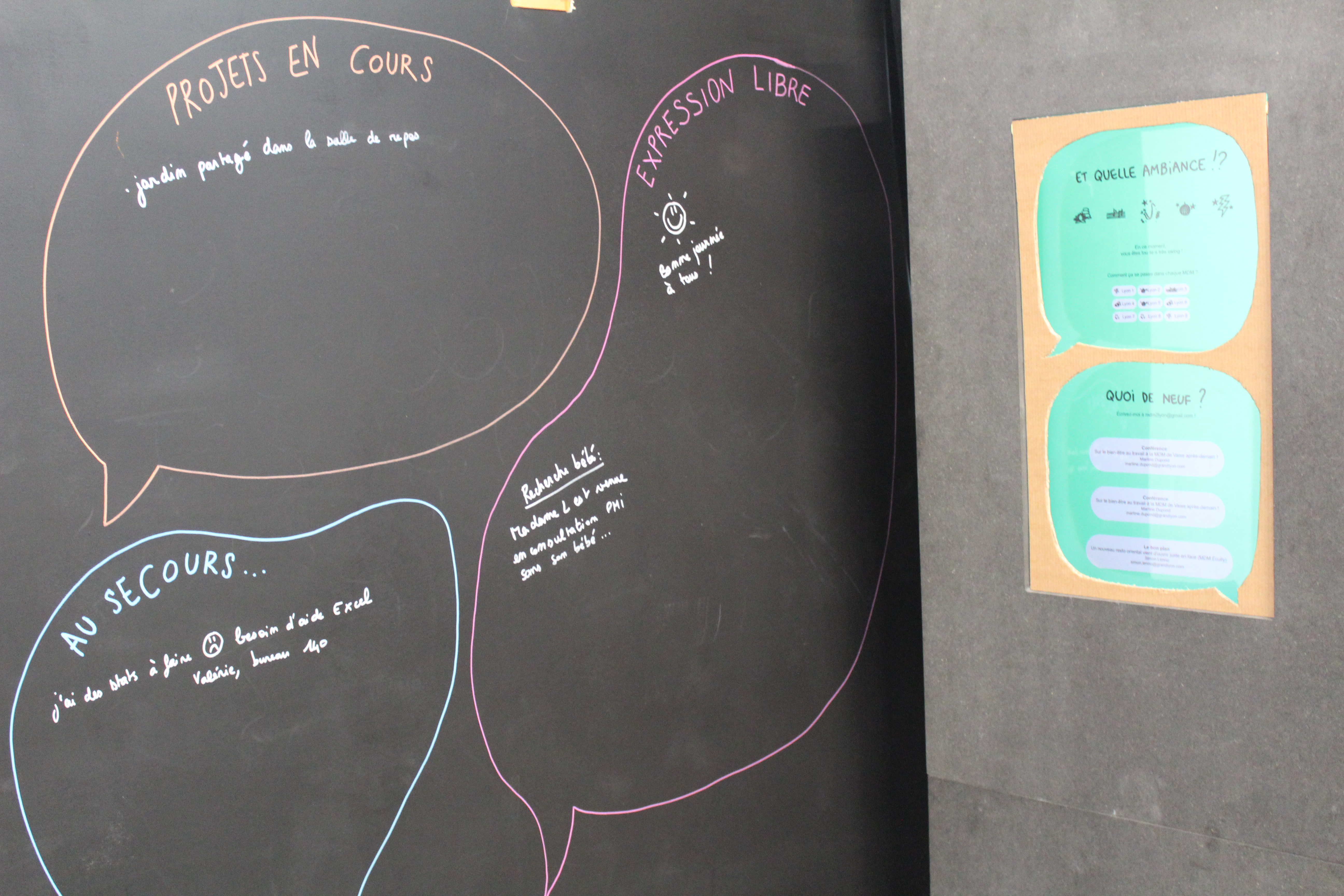 Pour alimenter la partie "Quoi de neuf", les agent·e·s de toutes les MDM ont la possibilité depuis leur poste de travail d'envoyer un mail avec en objet le thème du contenu (exemple : Bons plans) et en texte le contenu en question. Ce mail sera transmis à l'écran de toutes les MDM qui affichera le message.