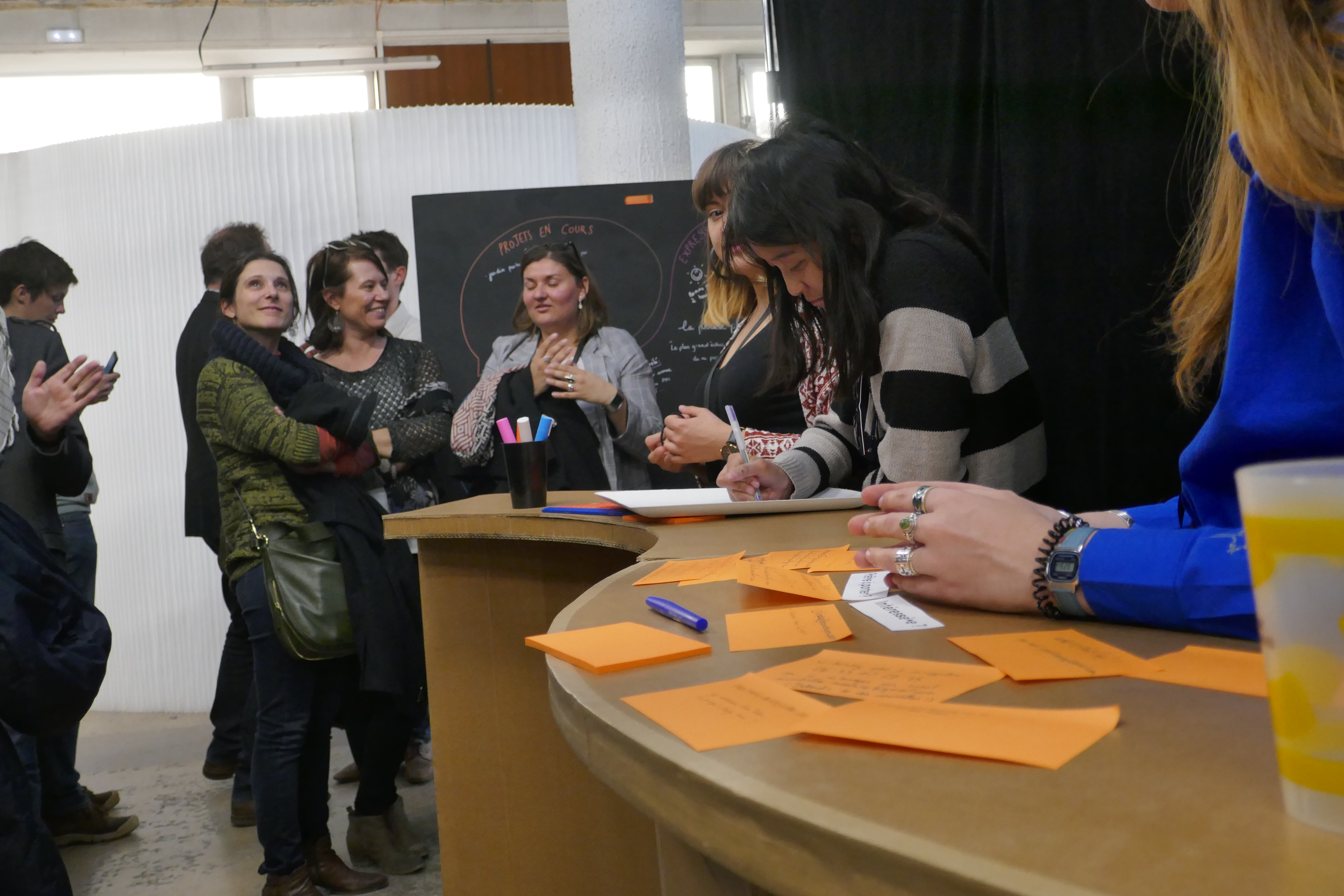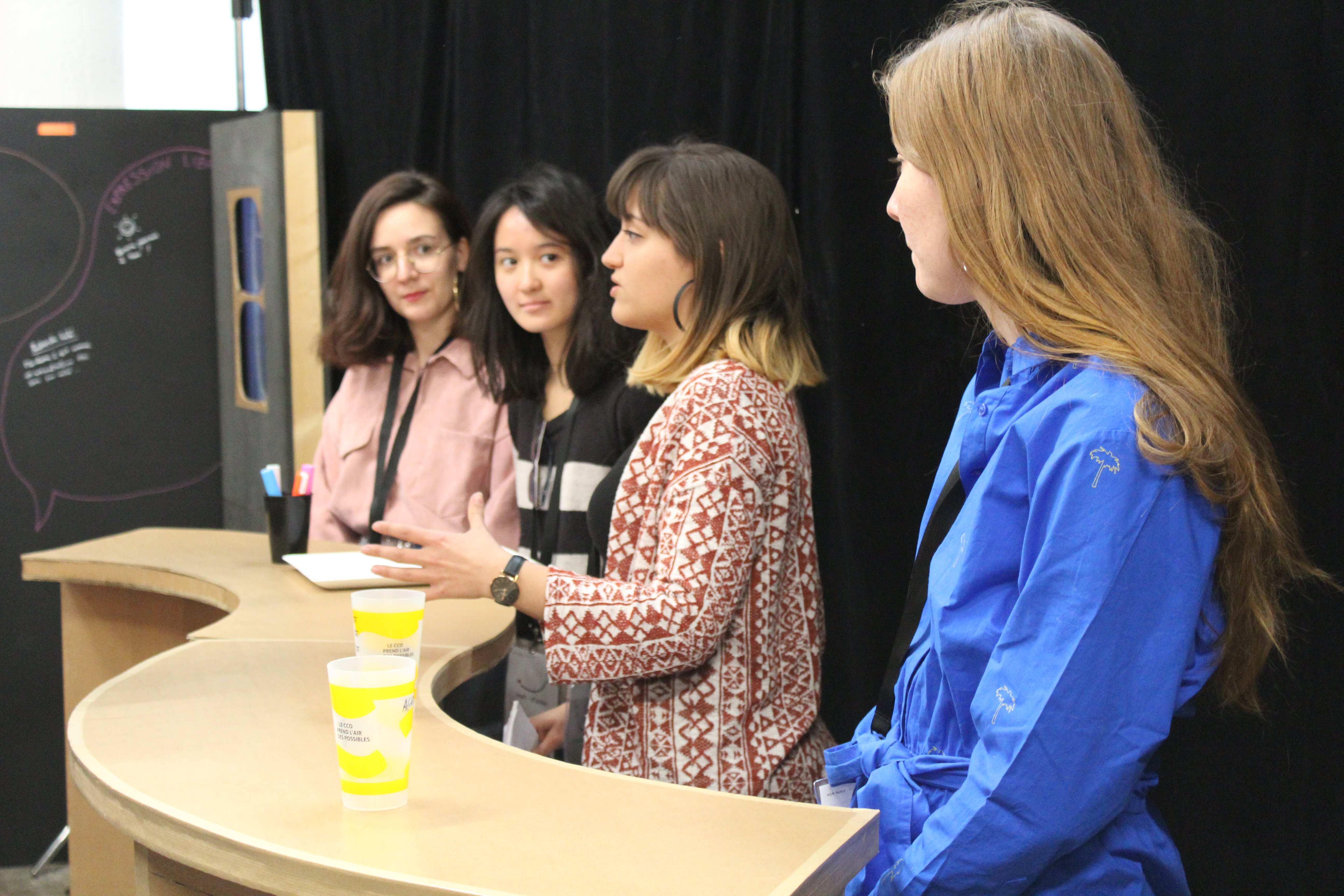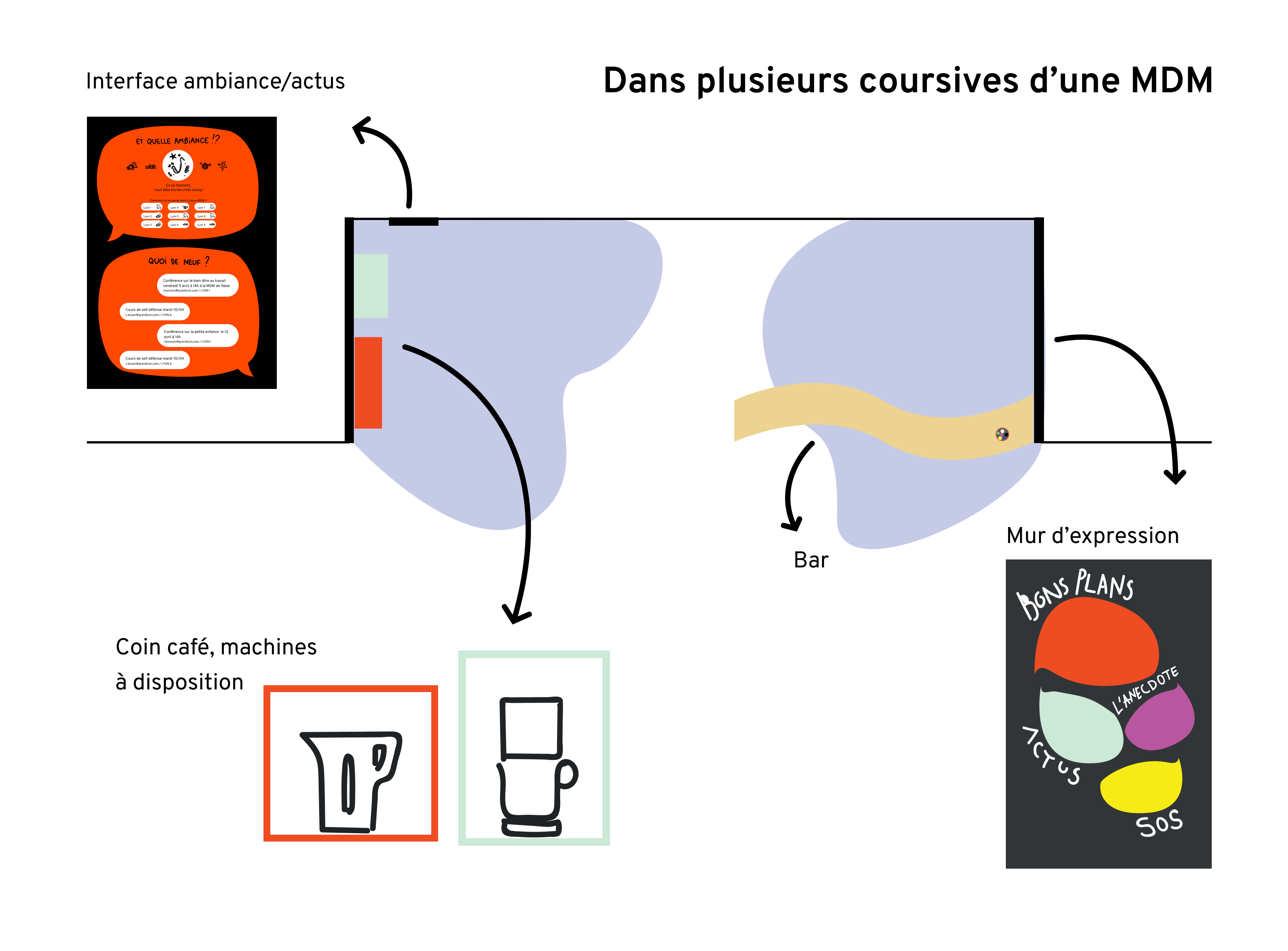 Un lieu modulaire est créé en regroupant des mobiliers interactifs : une interface tactile responsable de l'ambiance et des actualités, un mur d'expression pour partager les bons plans et demander des coups de main, ou encore le traditionnel coin café.