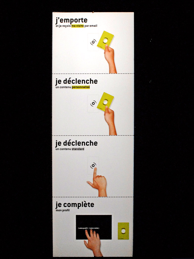 L’interaction est confirmée par un retour visuel : changement de couleur (la led prend la couleur de la carte=je suis bien reconnu, le contenu qui est affiché est en lien avec mon profil), changement de rythme de la led. Cela lance le contenu (sur un cartel augmenté) suivant son profil : la langue mais aussi la complexité du contenu change. Le retour visuel semble très important pour que cela deviennet intuitif.