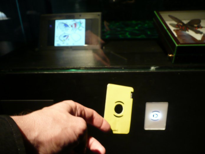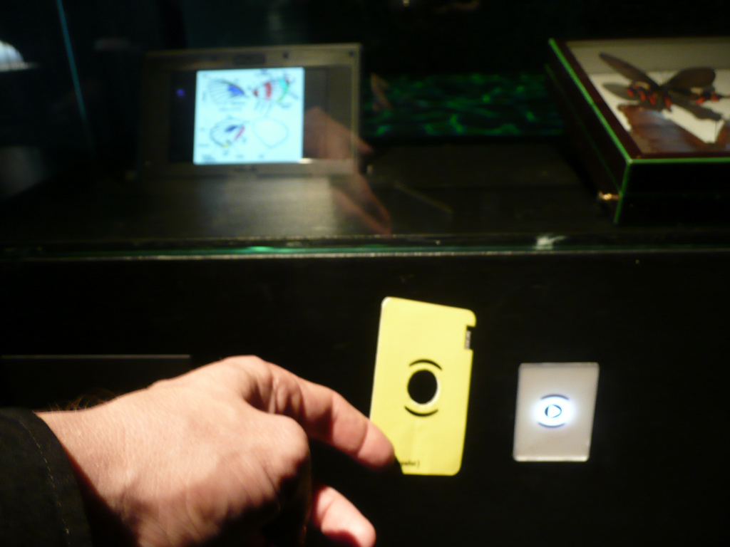 Une leçon du museolab 1 était qu’il est très important que le visiteur ait la perception de l’interaction pour profiter de la personnalisation et y trouver un bénéfice. Nous avons donc éliminé toute solution de détection automatique (qui sont de plus contraire à l’idée de rendre le visiteur acteur et d’être dans une relation de confiance) pour préférer un geste du visiteur.