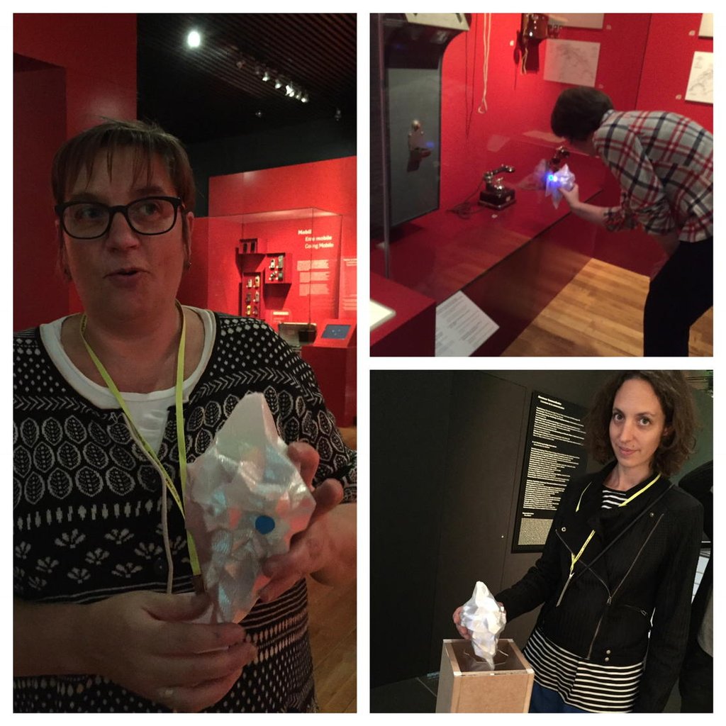 Nous sommes là dans un archétype de dispositif que l’on retrouve régulièrement dans les muséomix ou les projets de médiation numérique : un objet physique (tangible et portant peu d’interaction) par réaction au smartphone (qui est banal et entre en concurrence d’attention avec l’exposition), permettant d’une manière ou d’une autre de capter la trajectoire du visiteur ou ses préférences, pour lui permettre d’approfondir sa visite ou de l’emporter avec soi (et souvent d’interagir avec d’autres visiteurs) ou alors intégrant une logique de jeu.